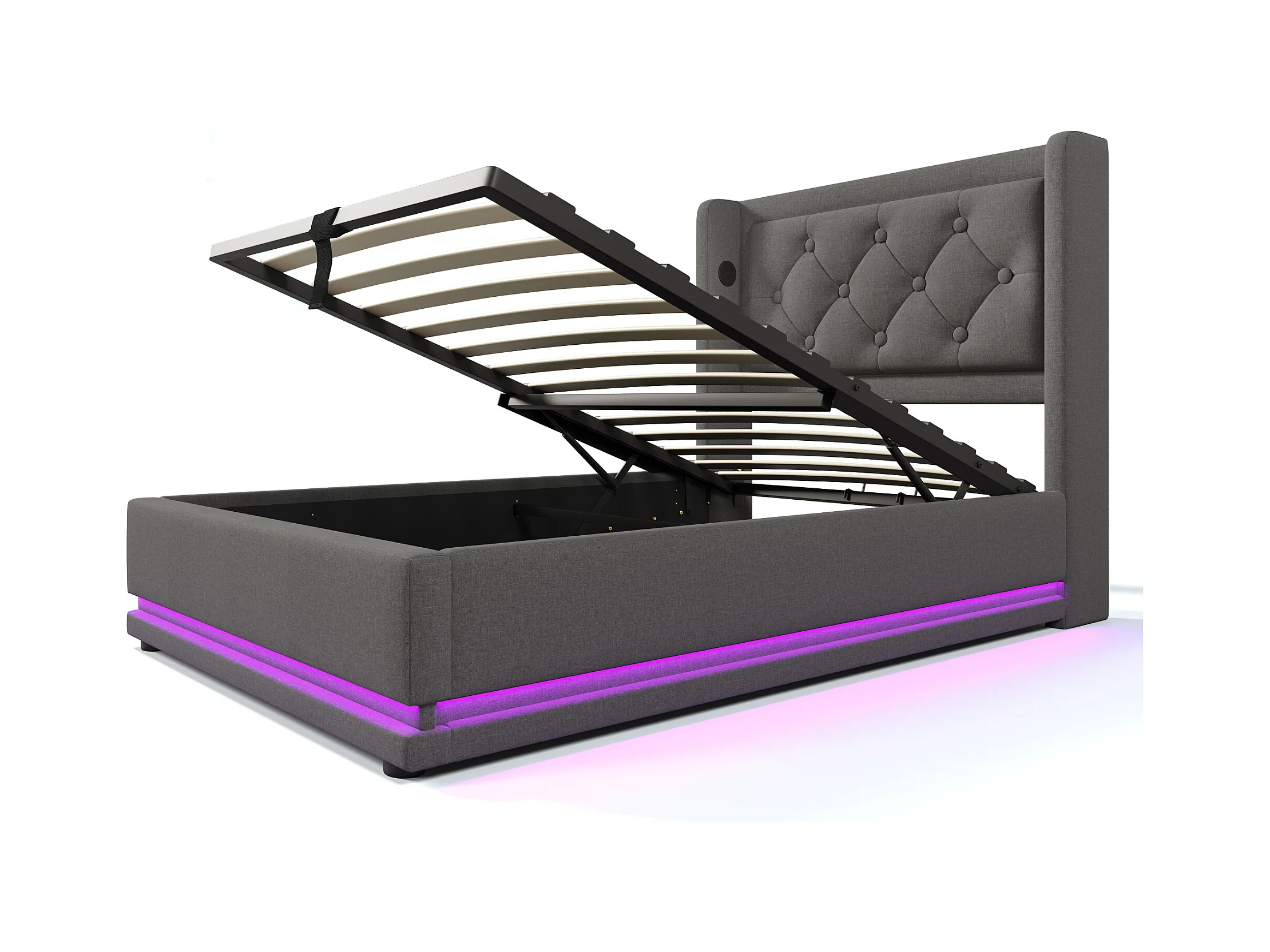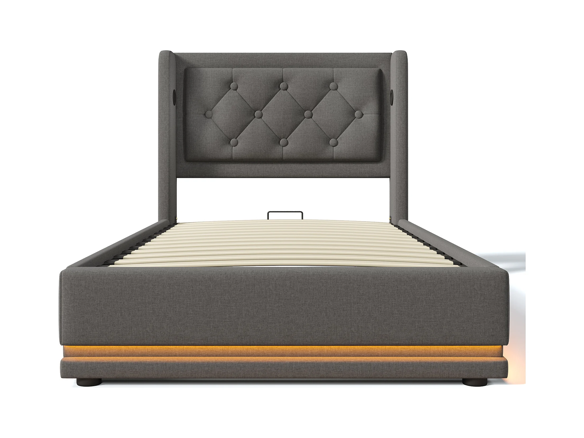 Bed met opbergruimte 90x200 cm, grijs katoen, tienerbed met led-lampje en USB-oplader, zonder matras