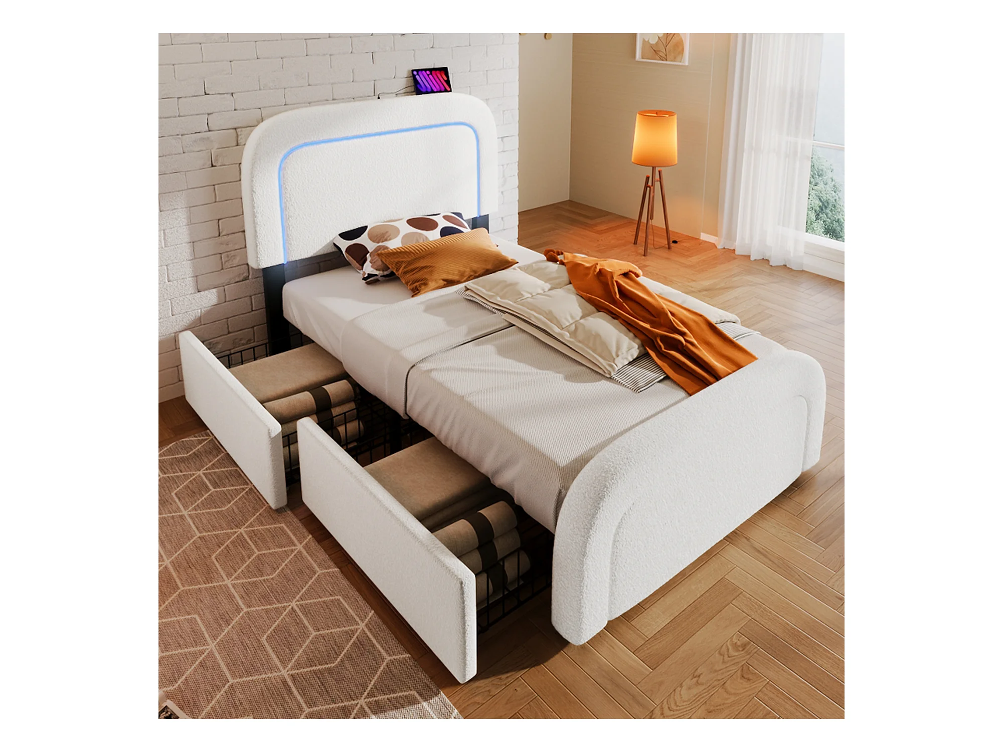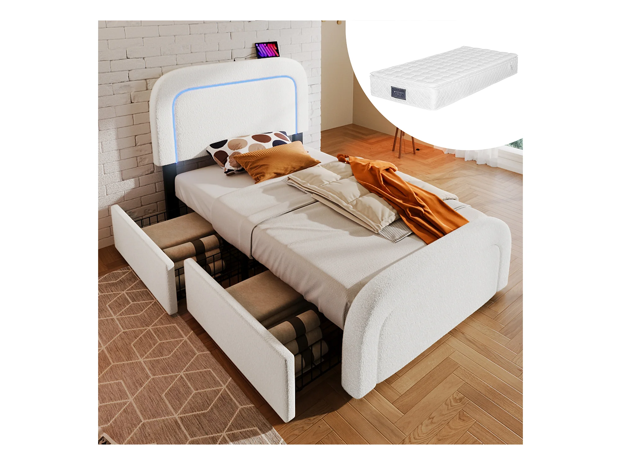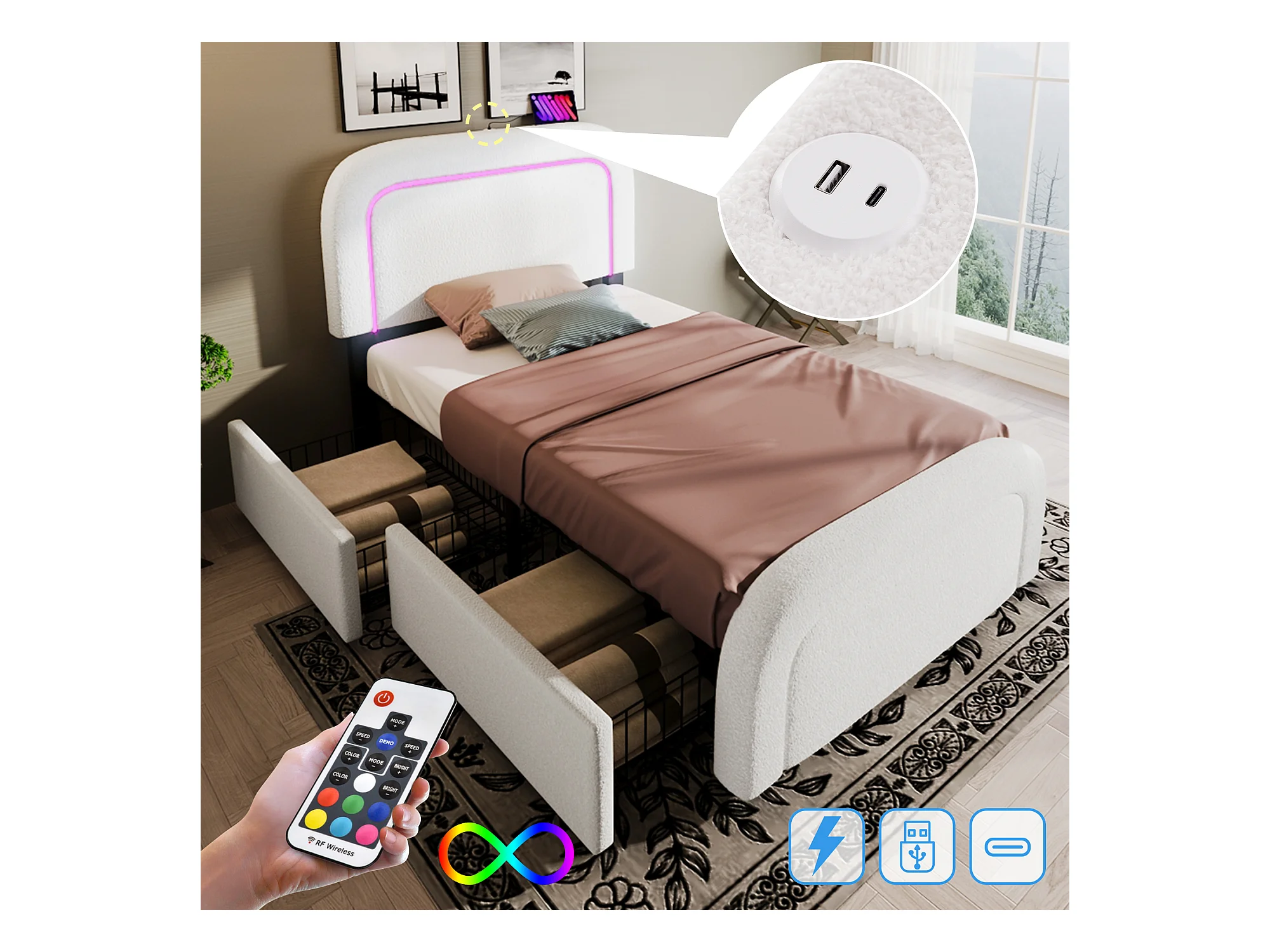 Bed met USB Type C oplaadfunctie, LED-verlichting en 2 lades, 90x200 cm, verstelbaar hoofdeinde, witte Sherpa, (afmetingen: 208x100x102,5 cm)