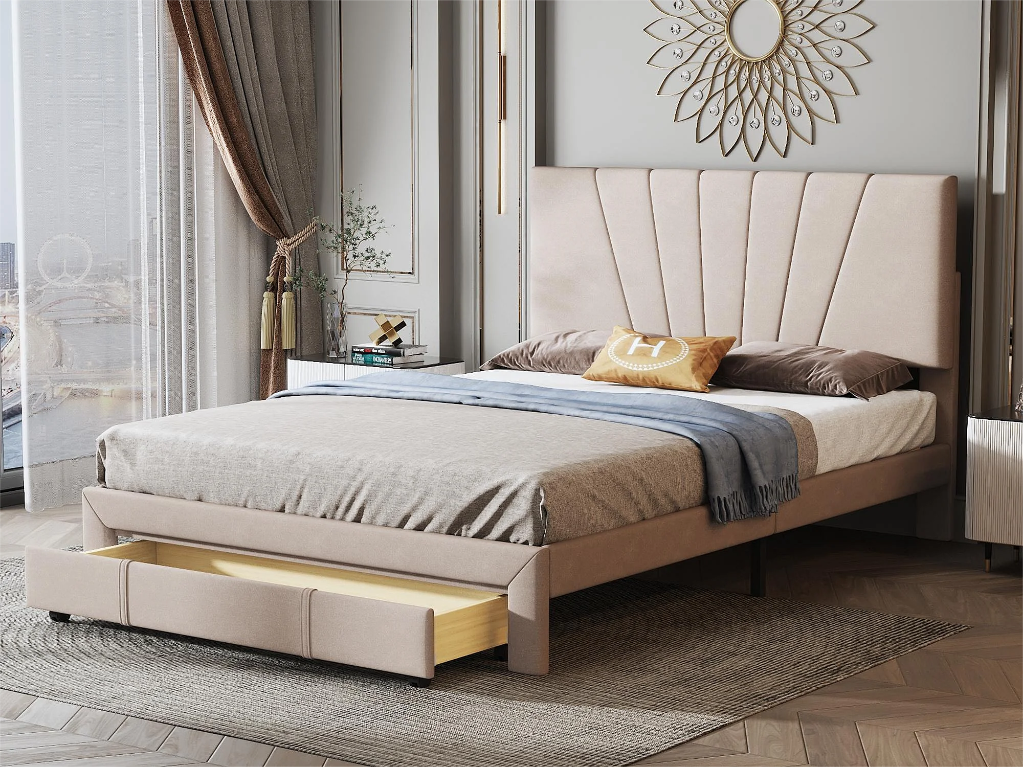 Bed met verstelbaar hoofdeinde - 140 x 200 cm - grote lade - fluweel - kleur donkerbeige