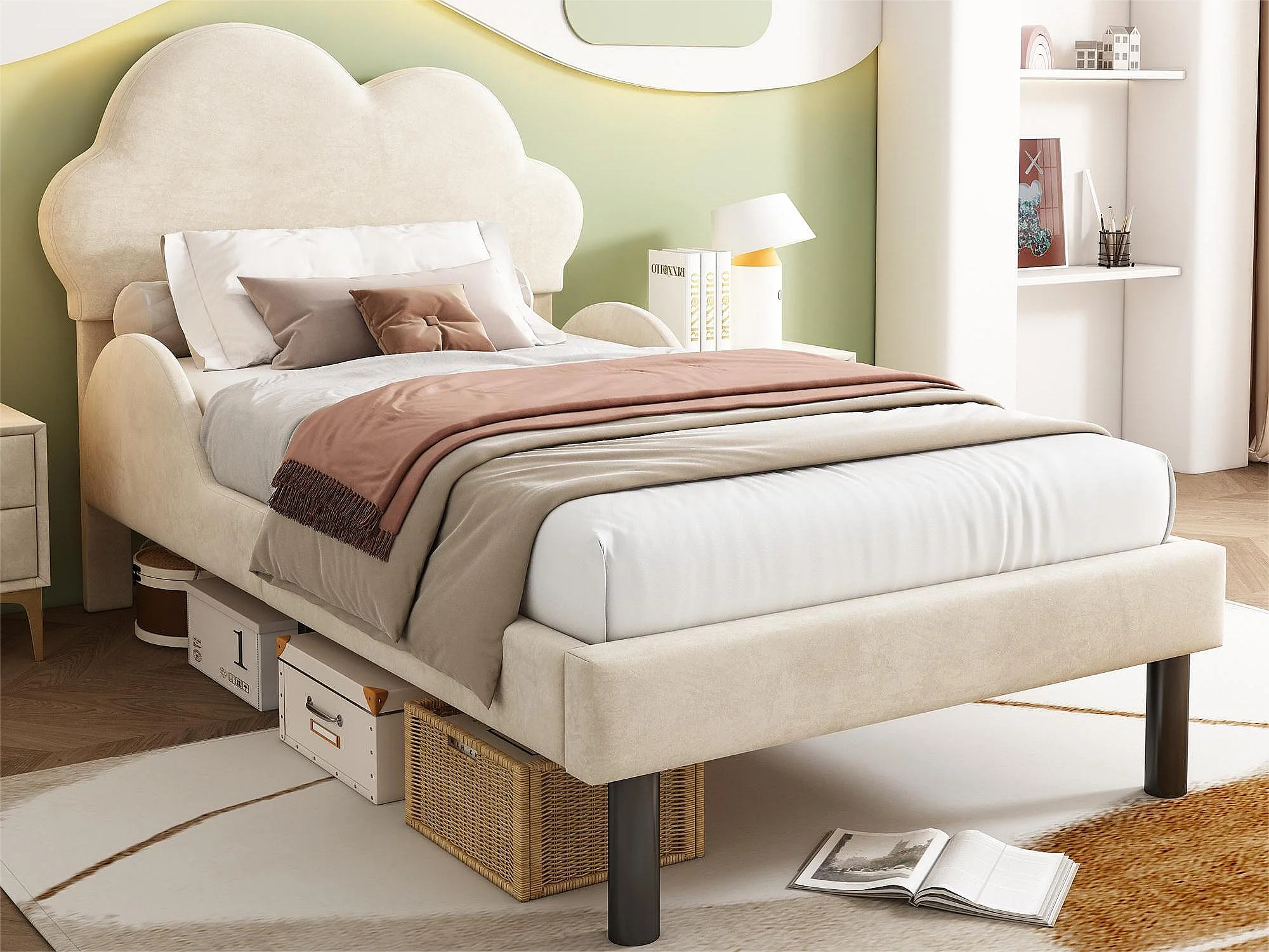 Bed met wolkvormig hoofdeinde - 90 x 200 cm - fluweel - kleur beige + lattenbodem