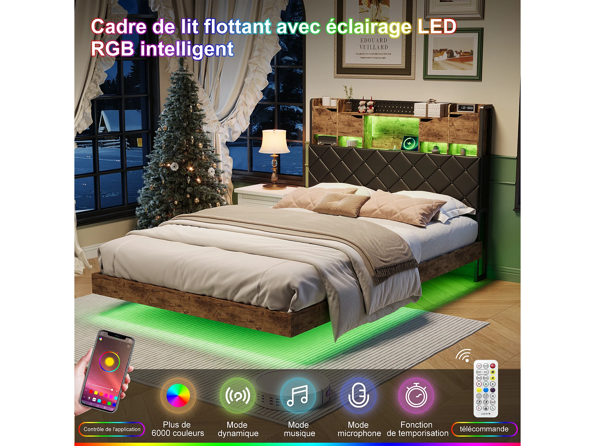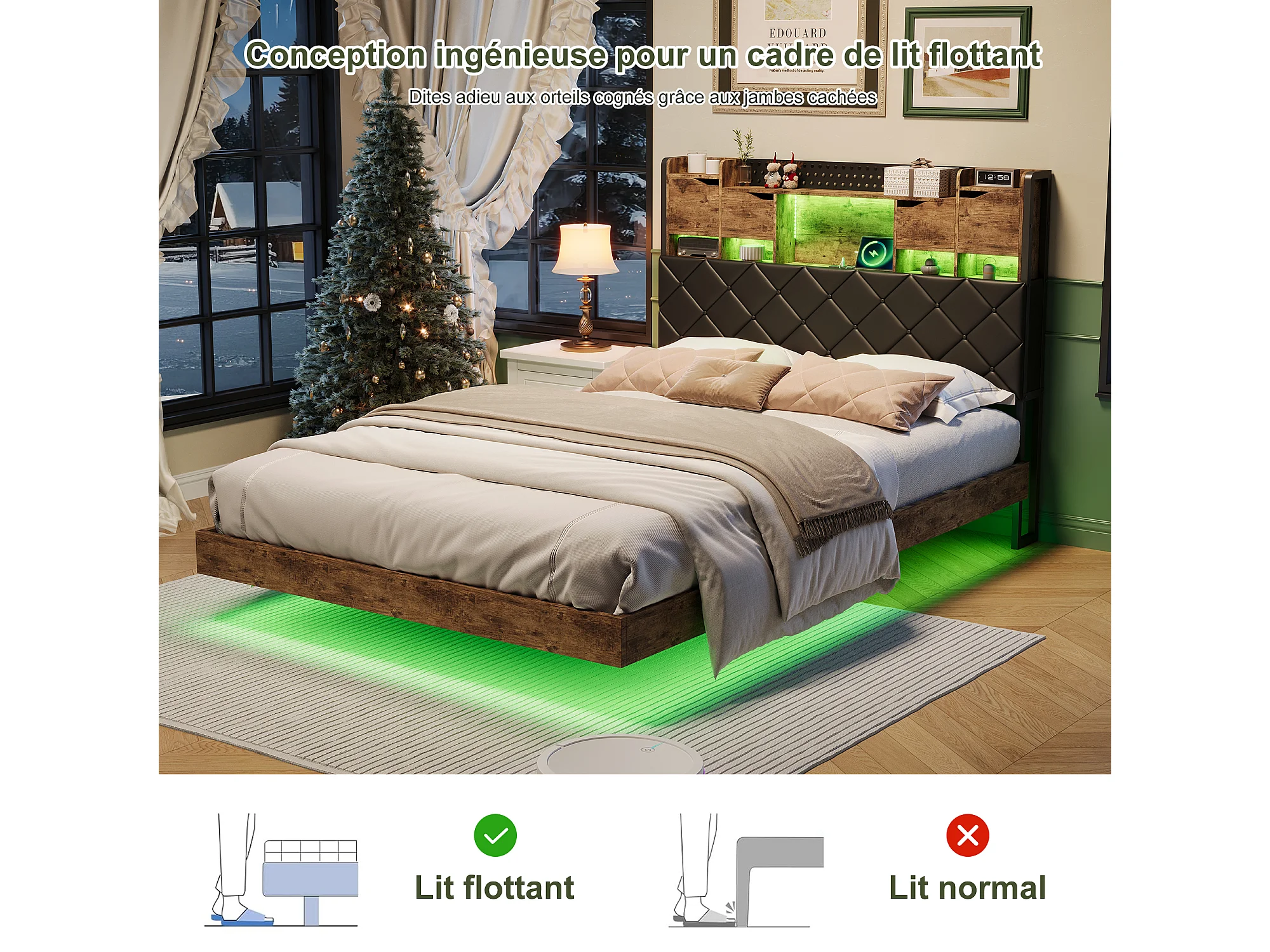 Bed van 160x200 cm met hoofdeinde, plank, geïntegreerde opbergruimte, ledverlichting en metalen frame - Maximale belasting 350 kg