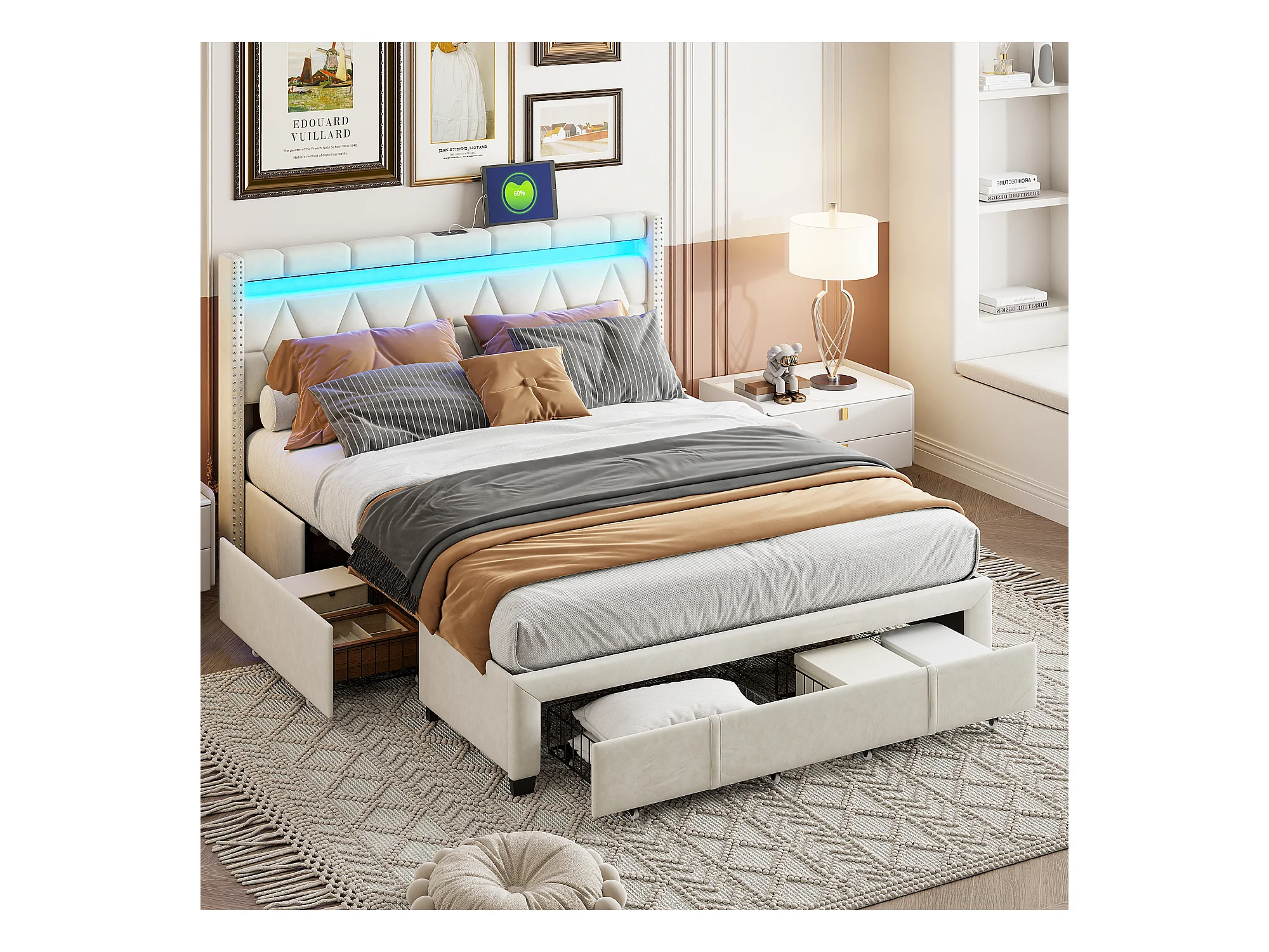 Bed van 160x200 cm met ruitvormig hoofdeinde, ledverlichting en USB-poorten, 4 metalen lades, beige linnen bekleding, modern en praktisch design