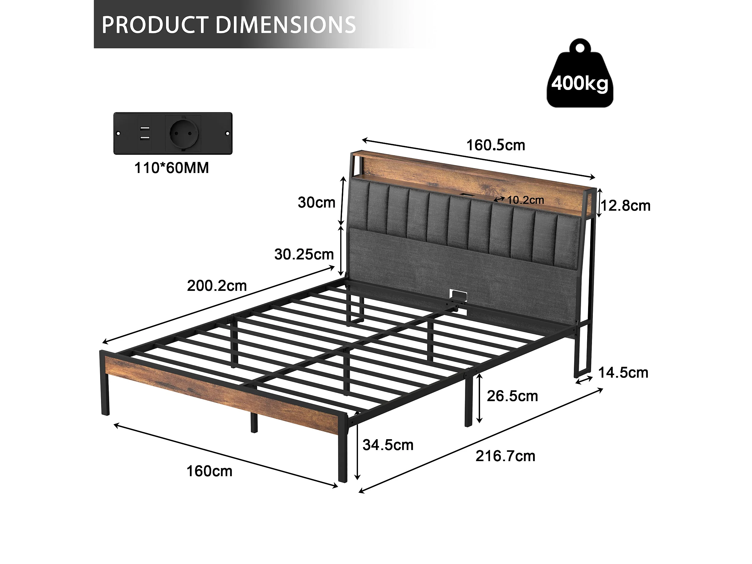Bedframe 160 x 200 met metalen basis, met ledverlichting en meerdere stopcontacten (1 AC-stopcontact, 2 USB-poorten), met opbergvak, hoogte 26,5 cm
