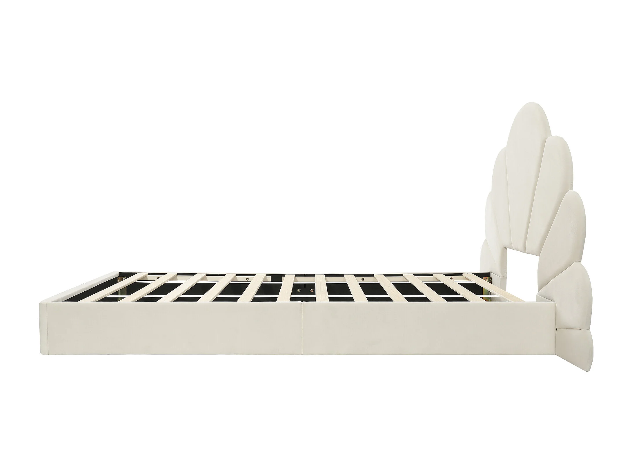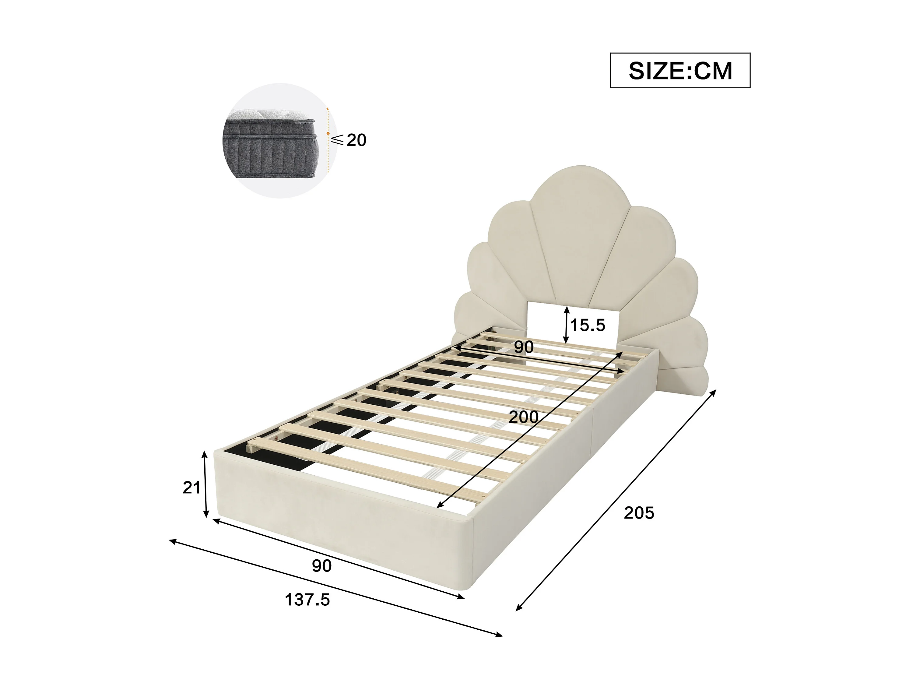 Beige fluwelen eenpersoonsbedframe, 90 x 200 cm, met bloemblaadjes hoofdeinde (matras niet inbegrepen)