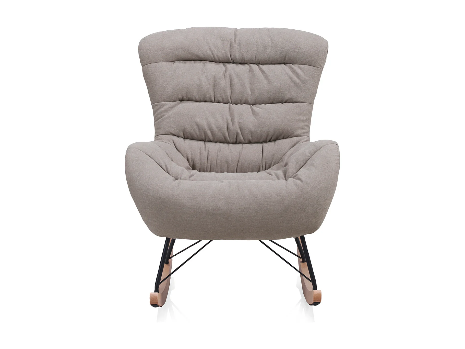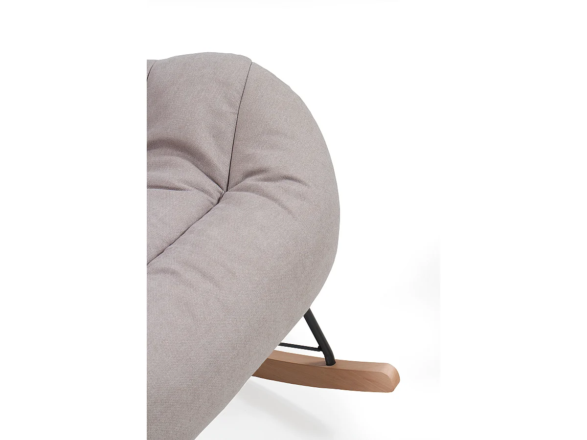 Beige schommelstoel, metalen poten en sledeonderstel van beukenhout