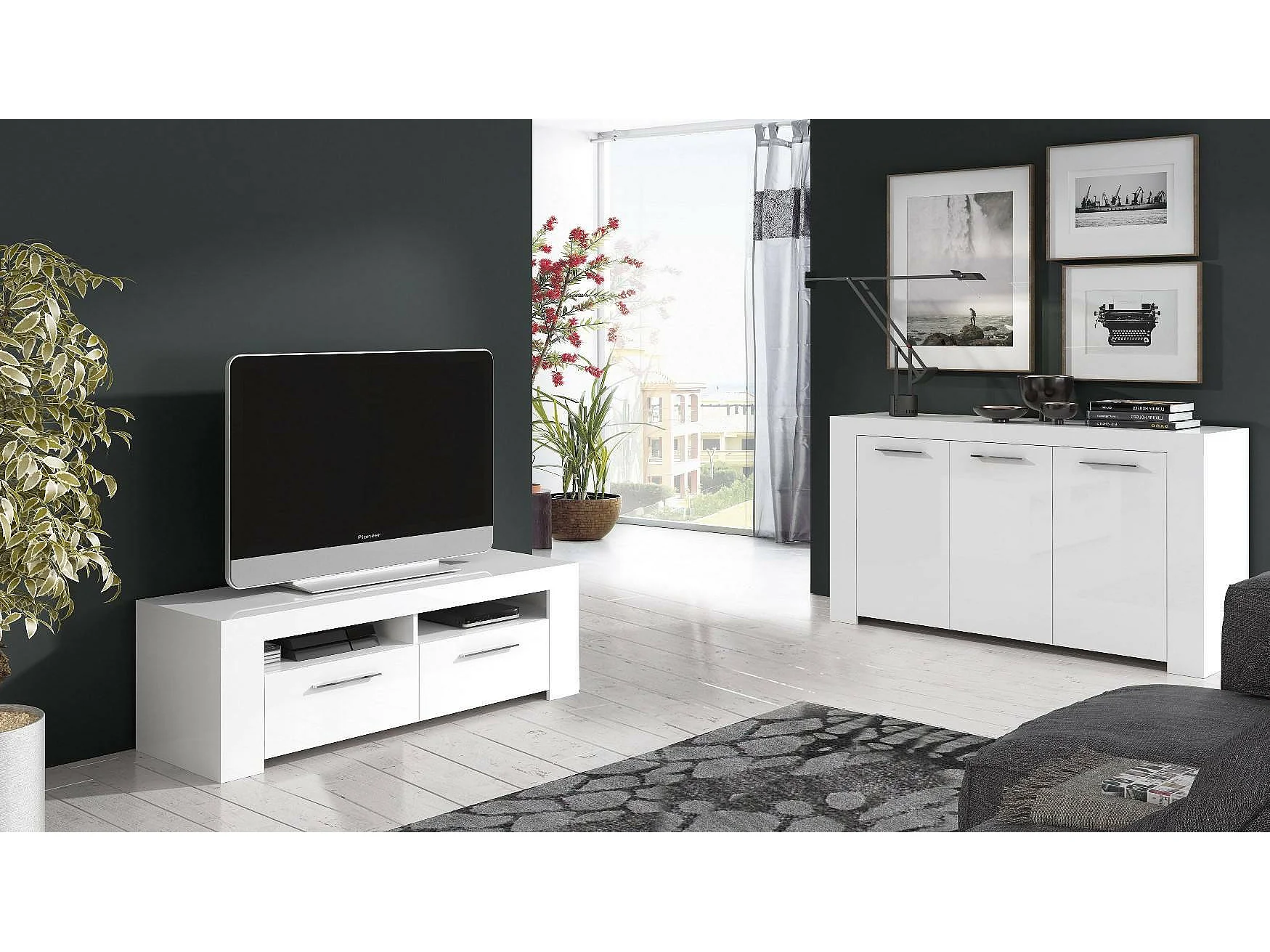 Bellevue dressoir, Modern dressoir met 3 deuren, Woonkamerbuffet, TV-kast, Dressoir voor woonkamer, 144x42h80 cm, Wit