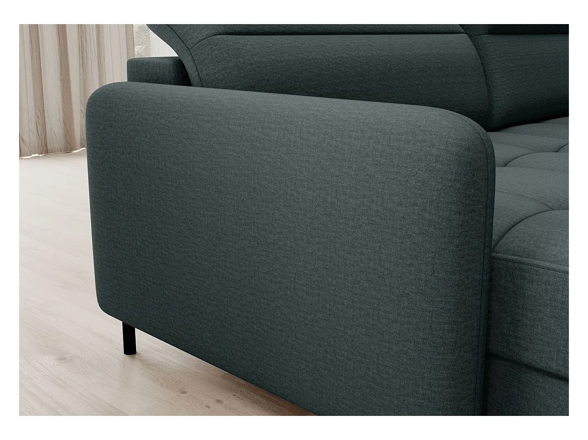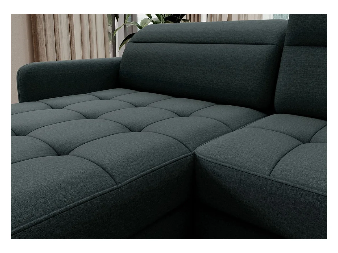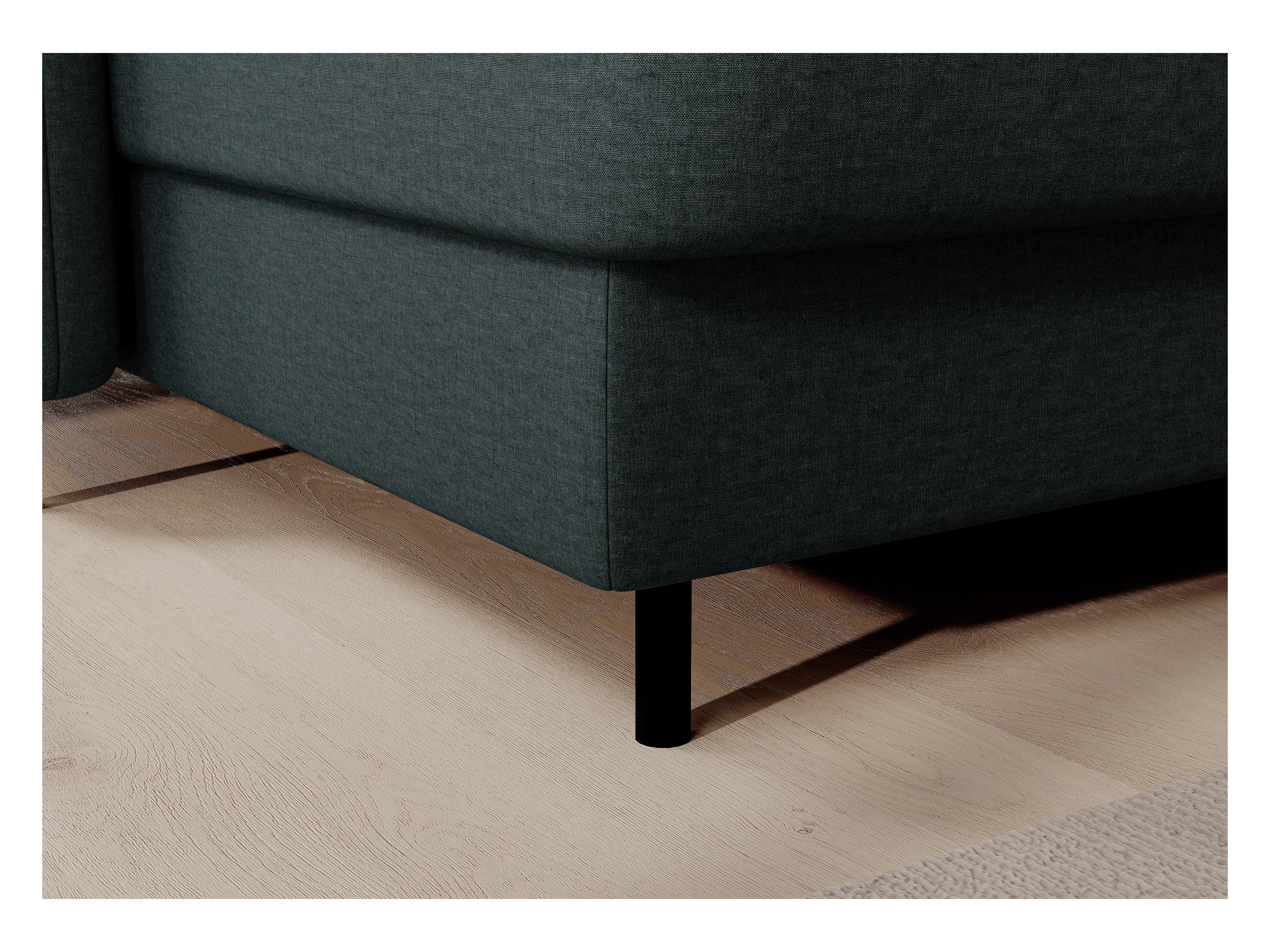 KATE omvormbare stoffen hoekbank met verstelbare hoofdsteunen – Zwarte metalen opbergruimte en poten-Kleur Dennengroen-linkerhoek