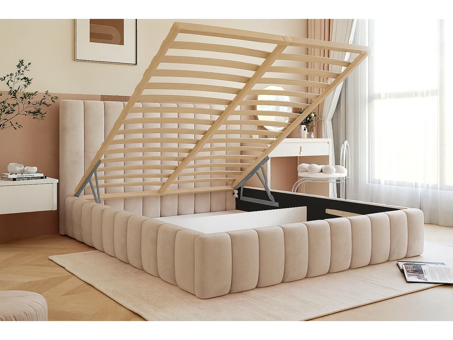 BESILIO Tweepersoonsbed 160x200 Tina – slank slaapkamerbed met lattenbodem en opbergruimte voor beddengoed – fluwelen stof – Grijs