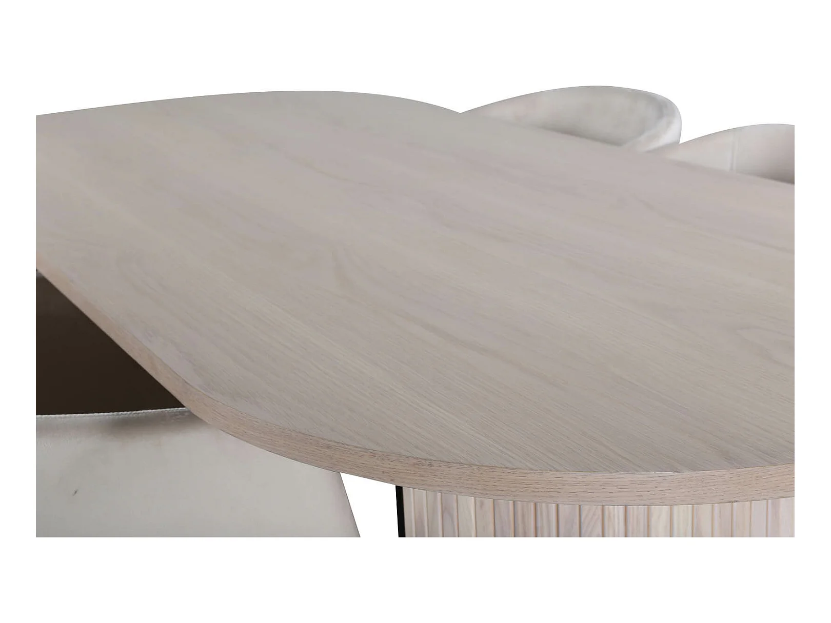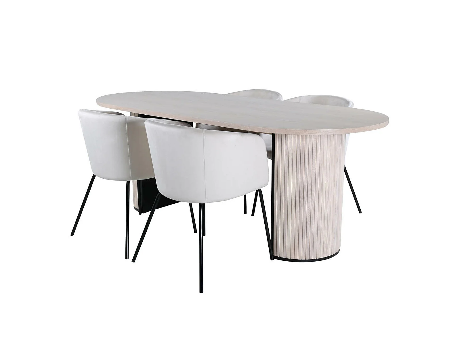 BiancaWW eethoek eetkamertafel eik fineer wit washed en 4 Berit eetkamerstal velours beige.