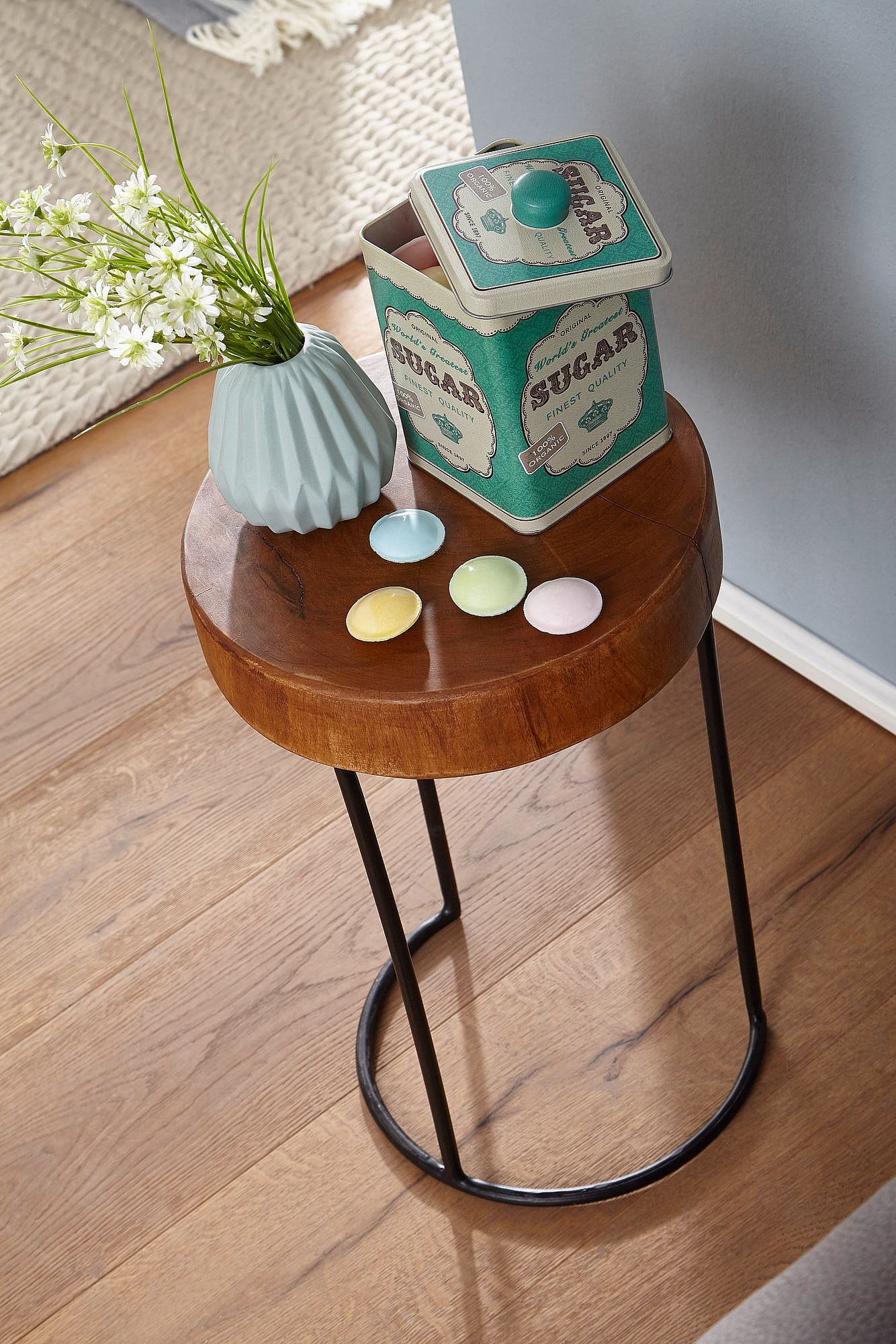 bijzettafel AKOLA massief hout Sheesham woonkamertafel metalen poten landhuisstijl boomstamvorm echt hout natuurlijk