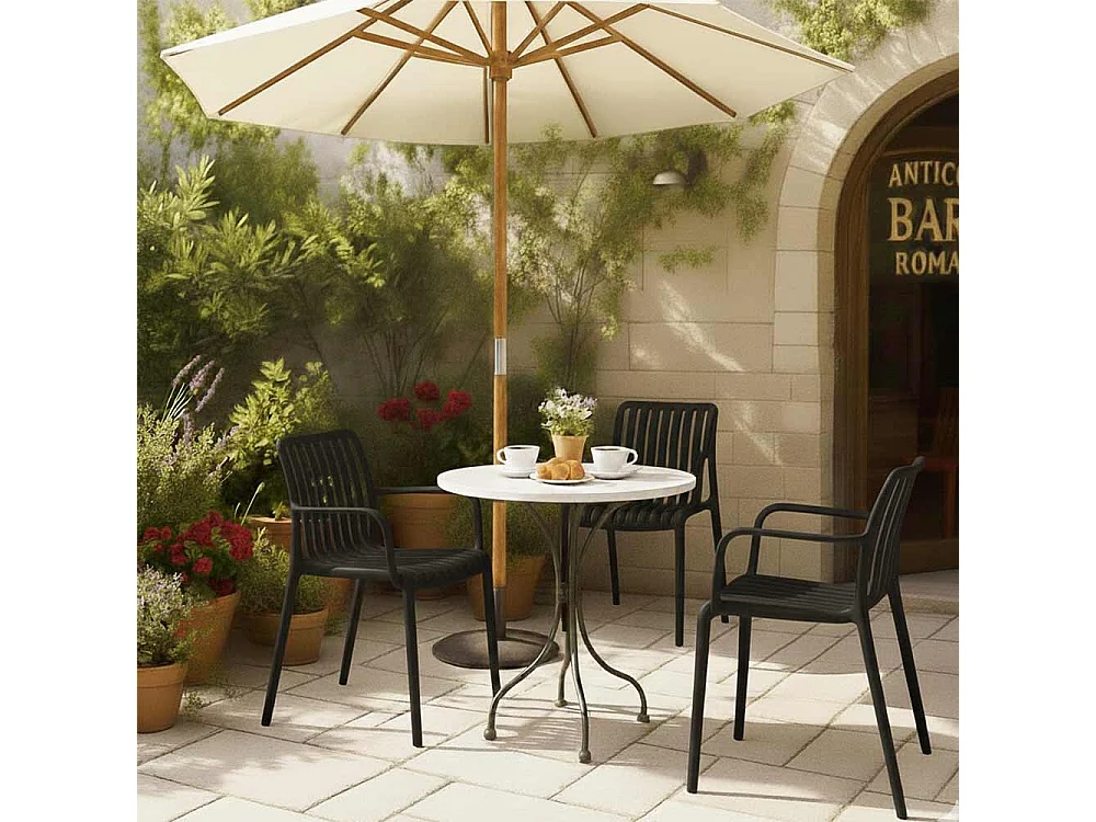 Binnenstoel voor buiten, uitgevoerd in petrolgroen kunststof met premium comfort en armleuningen.
