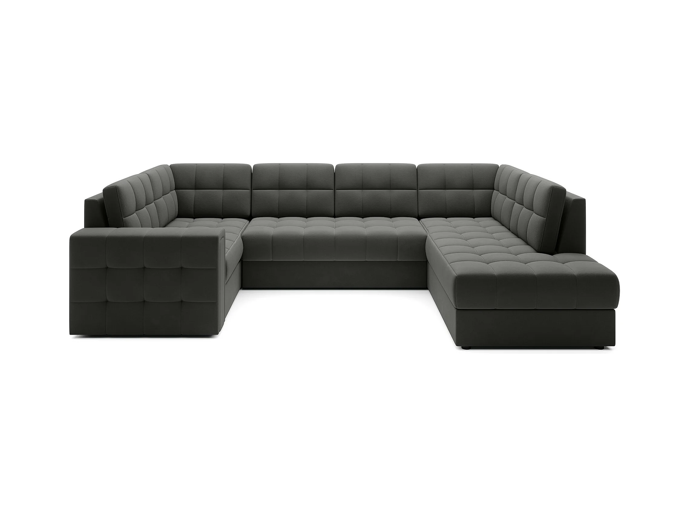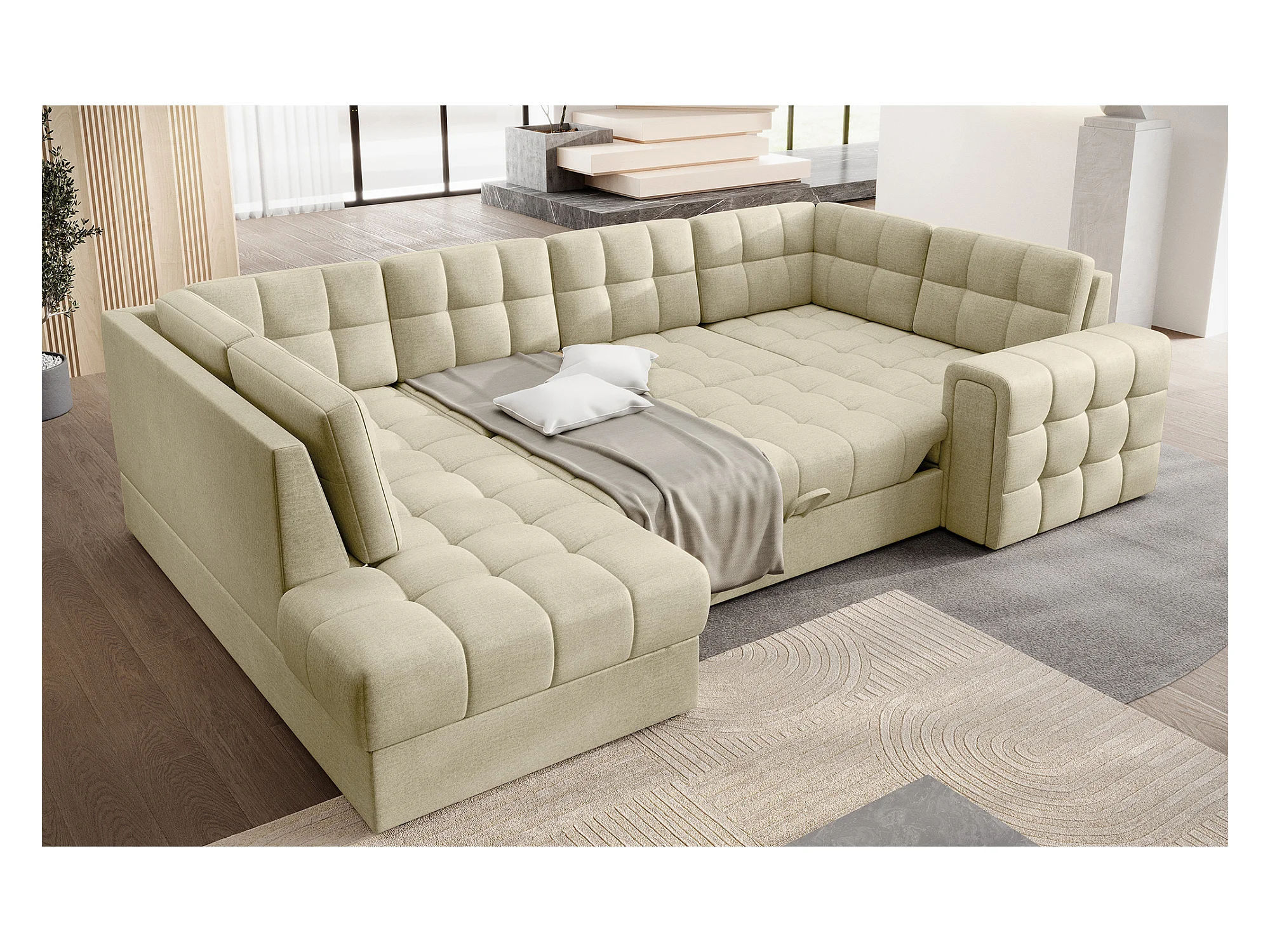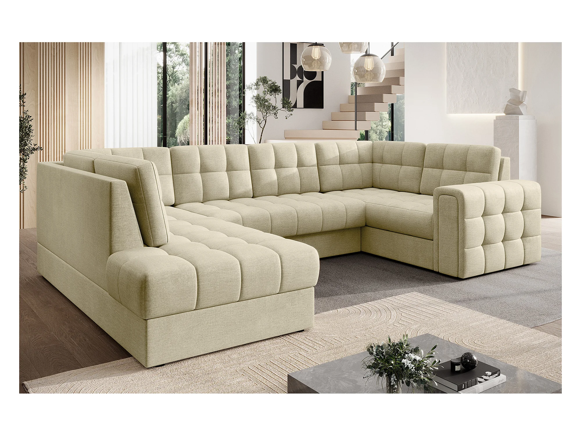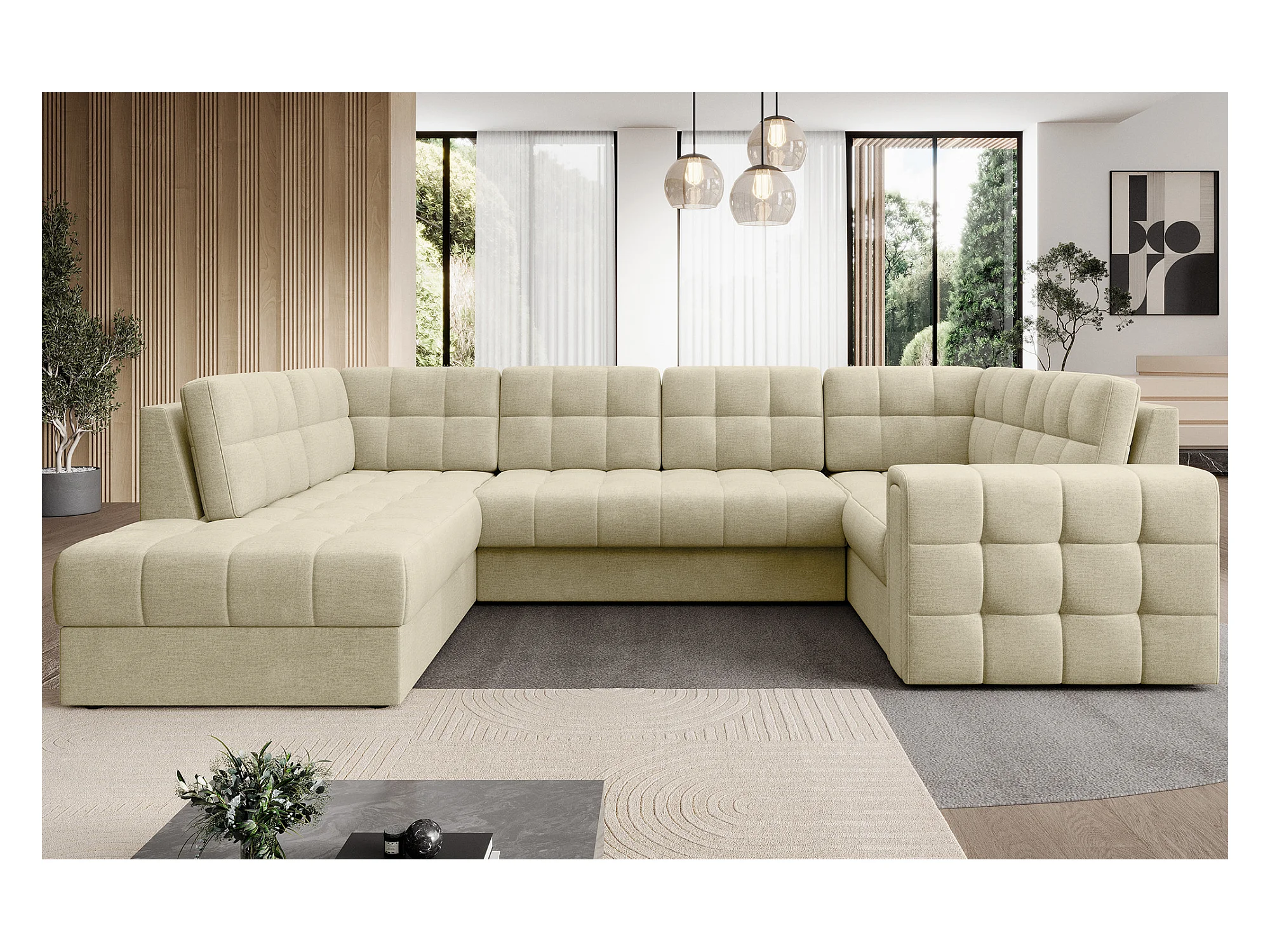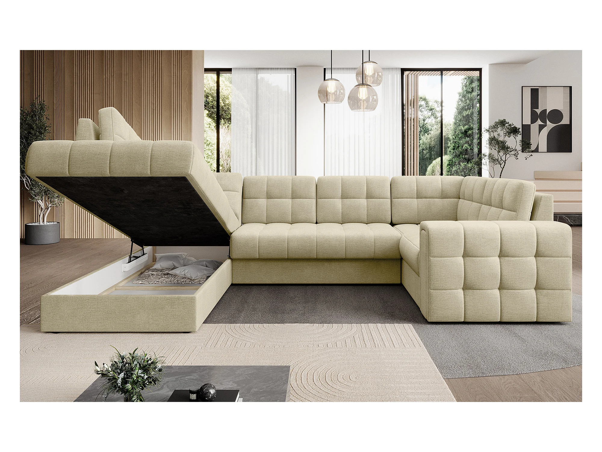 BLOOM panoramische bank in gecapitonneerd fluweel - Opbergruimte en omvormbaar-Kleur Licht beige-Opslagruimte naar rechts
