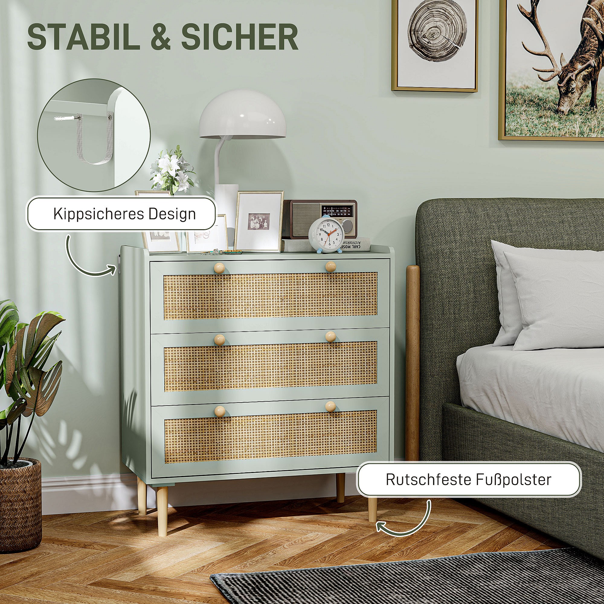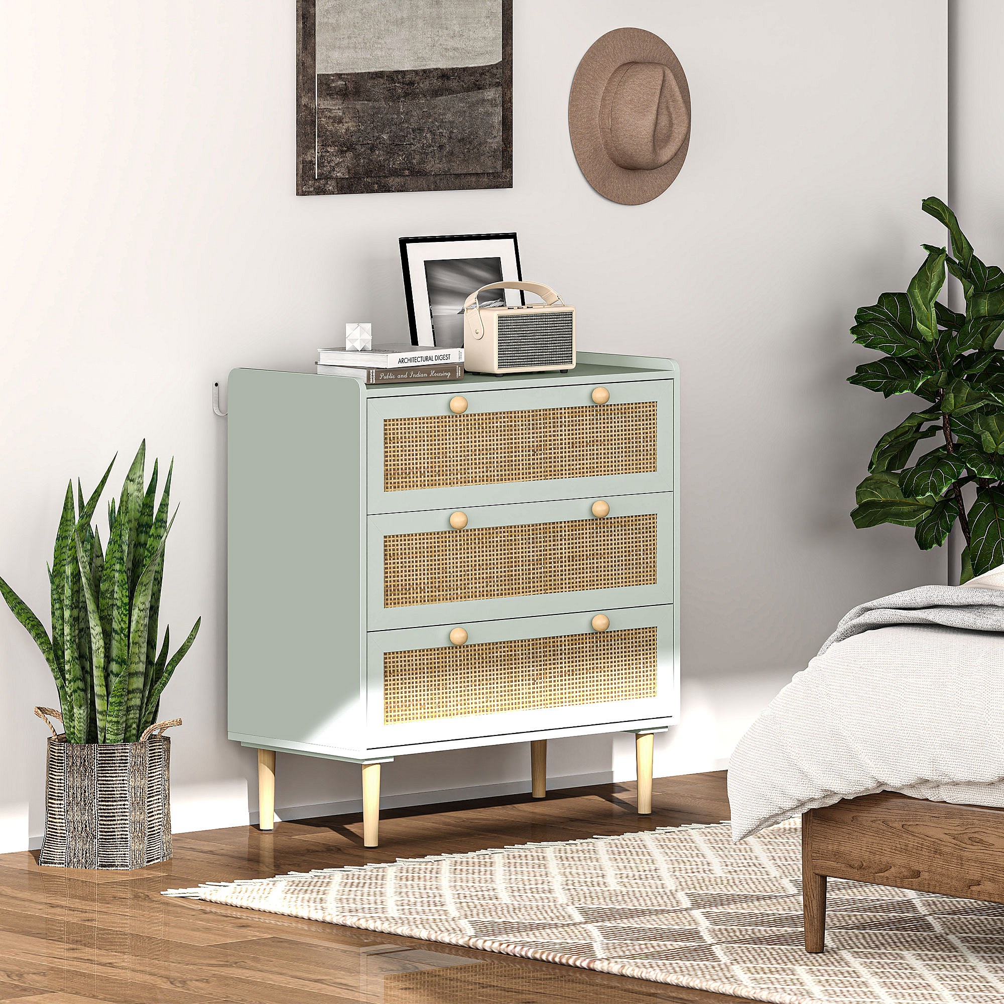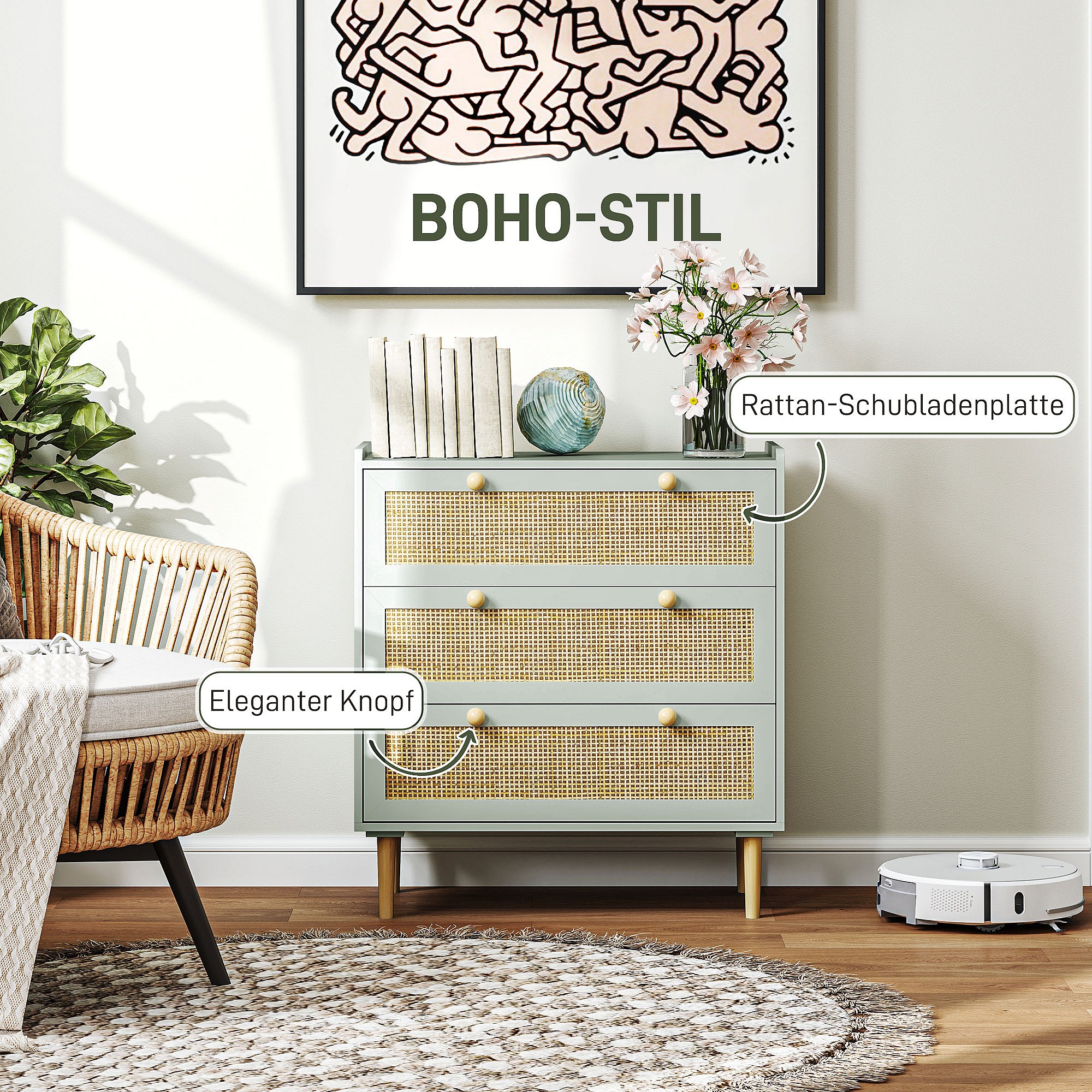 Boho rotan ladekast met 3 lades - lichtblauw, 80 x 40 x 87,5 cm, trendy design en praktische opbergruimte voor woonkamer en slaapkamer