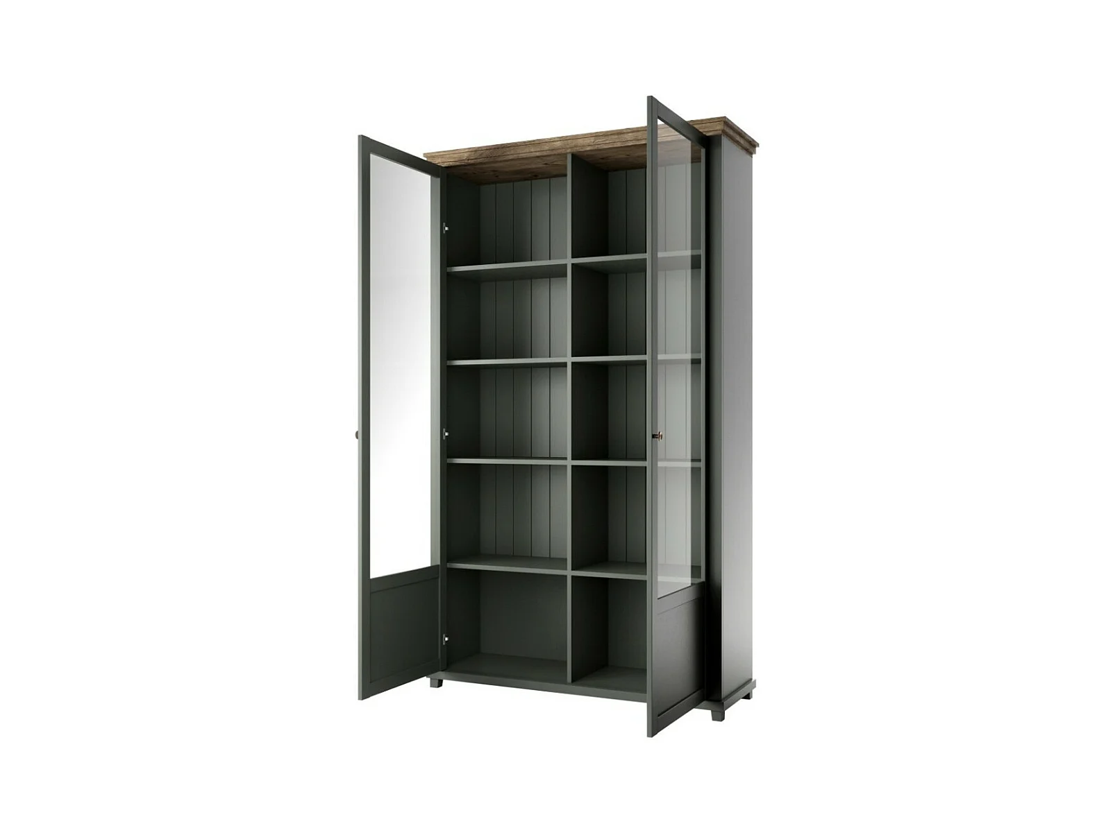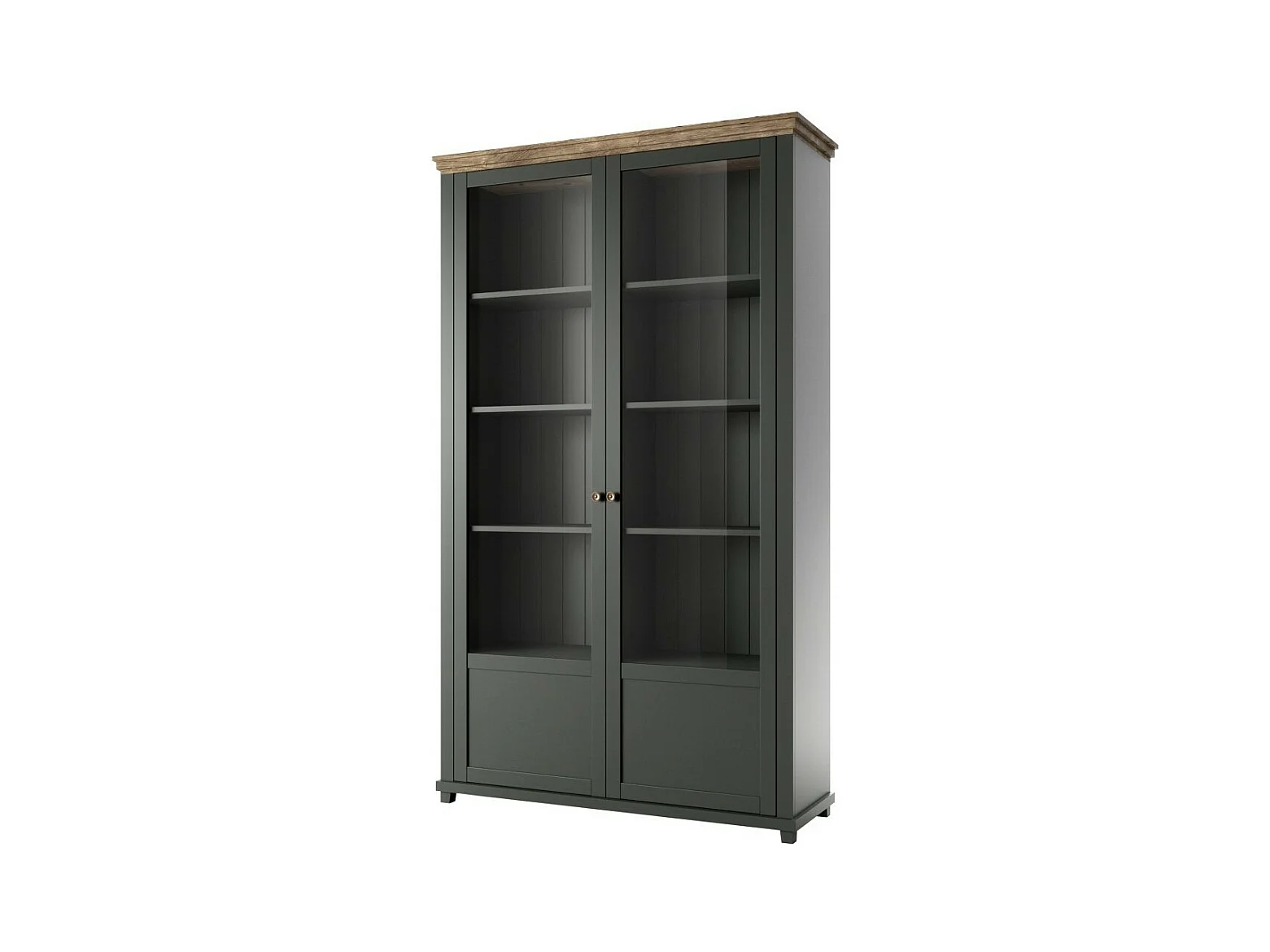Brede vitrinekast met 2 deuren en geïntegreerde LED's uit de collectie ASSIA. Kleur groen en eiken.