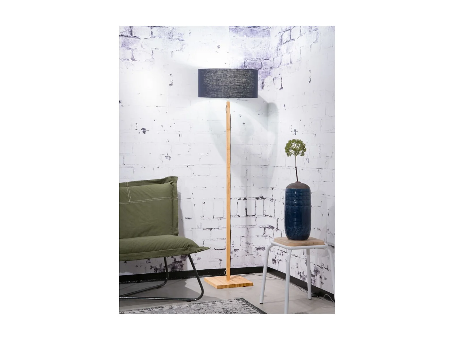 Bruine bamboe stam vloerlamp met donkerblauwe lampenkap