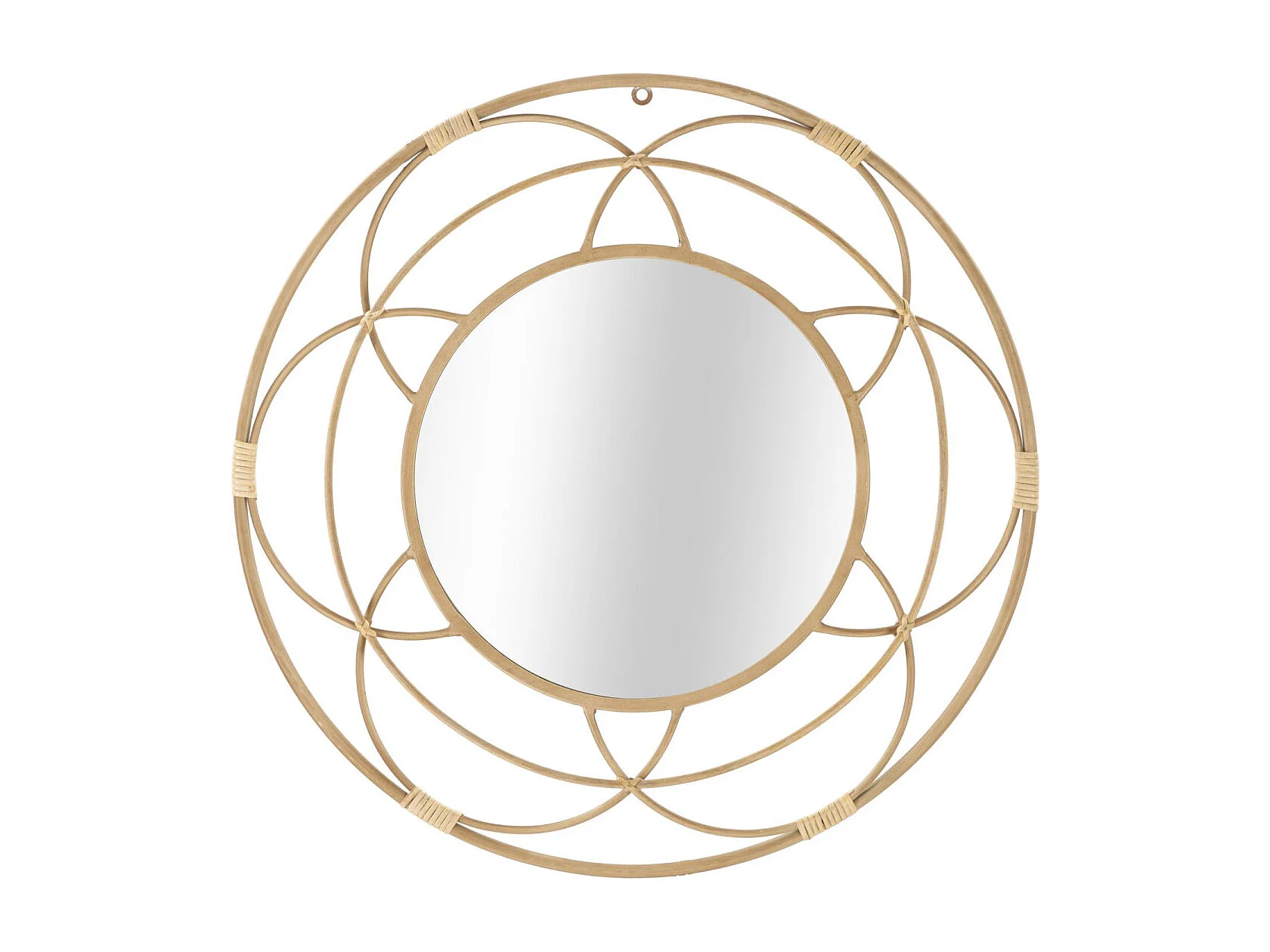 Ronde wandspiegel Bloem van beige rotan 56 cm met centraal spiegel van 23,5 cm om aan de muur te bevestigen