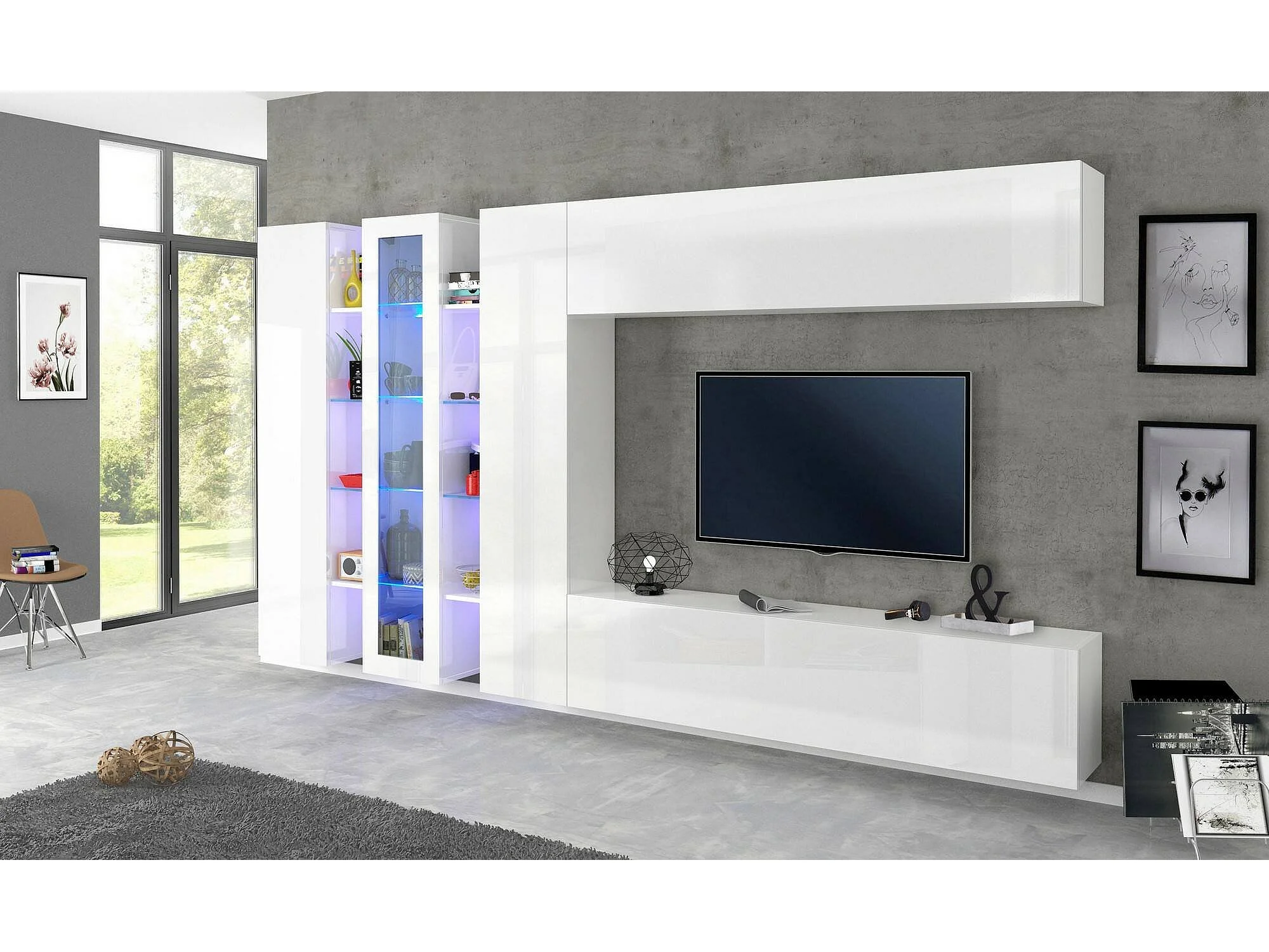 Dmora Woonkamerkast Bruno 30x340x180h cm Wit Glanzend, 22 Planken, Draaideuren en Klepdeuren, 4 Deuren Made in Italy
