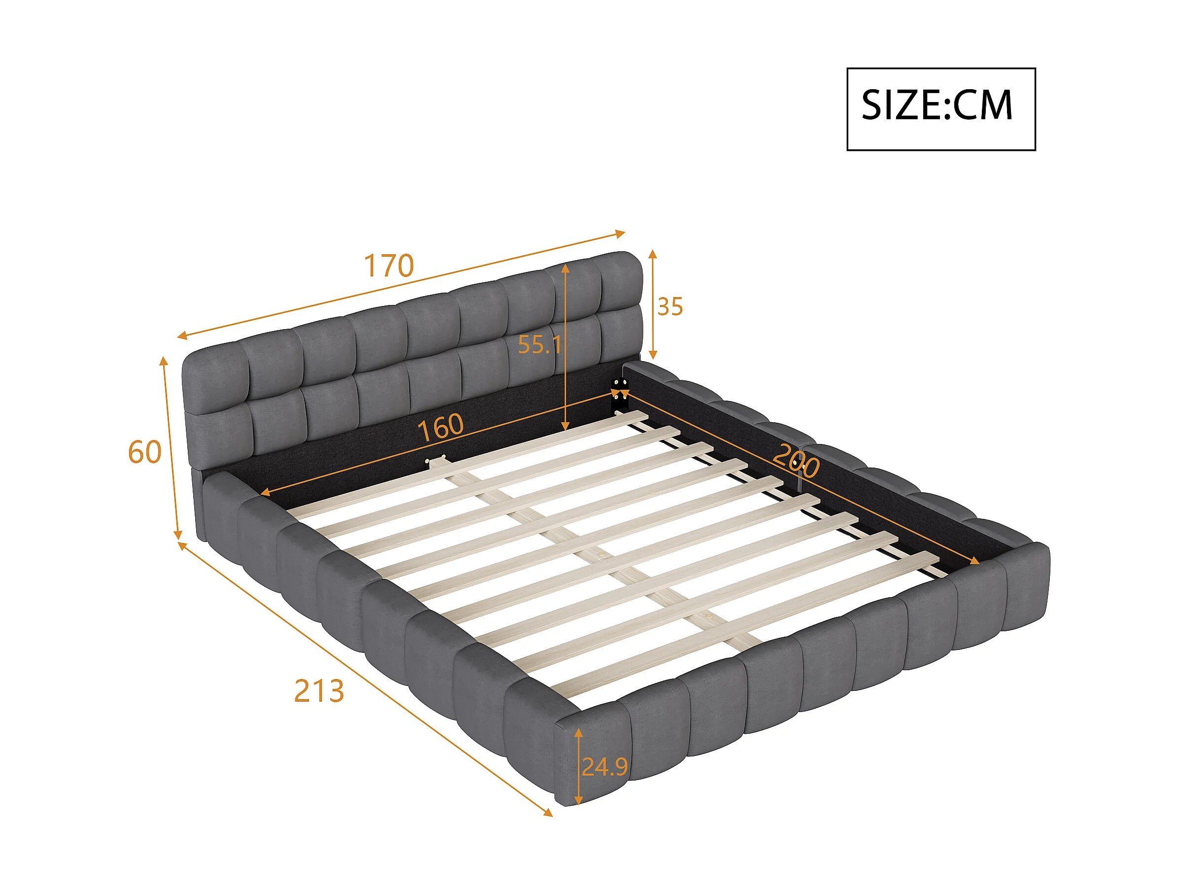 Bubbelbed 160 x 200 cm met lattenbodem en rugleuning, gestoffeerd tweepersoonsbed, linnen, grijs