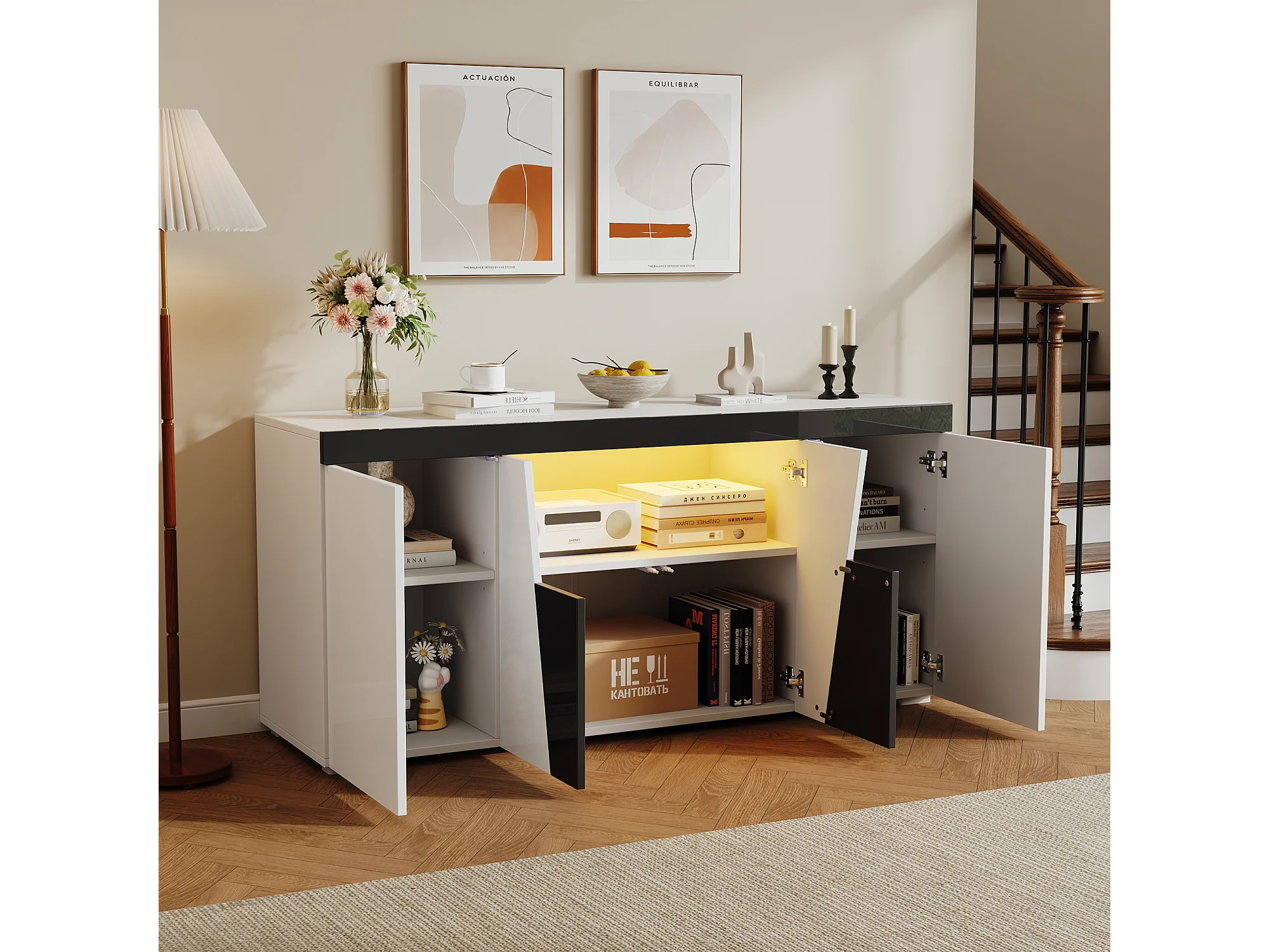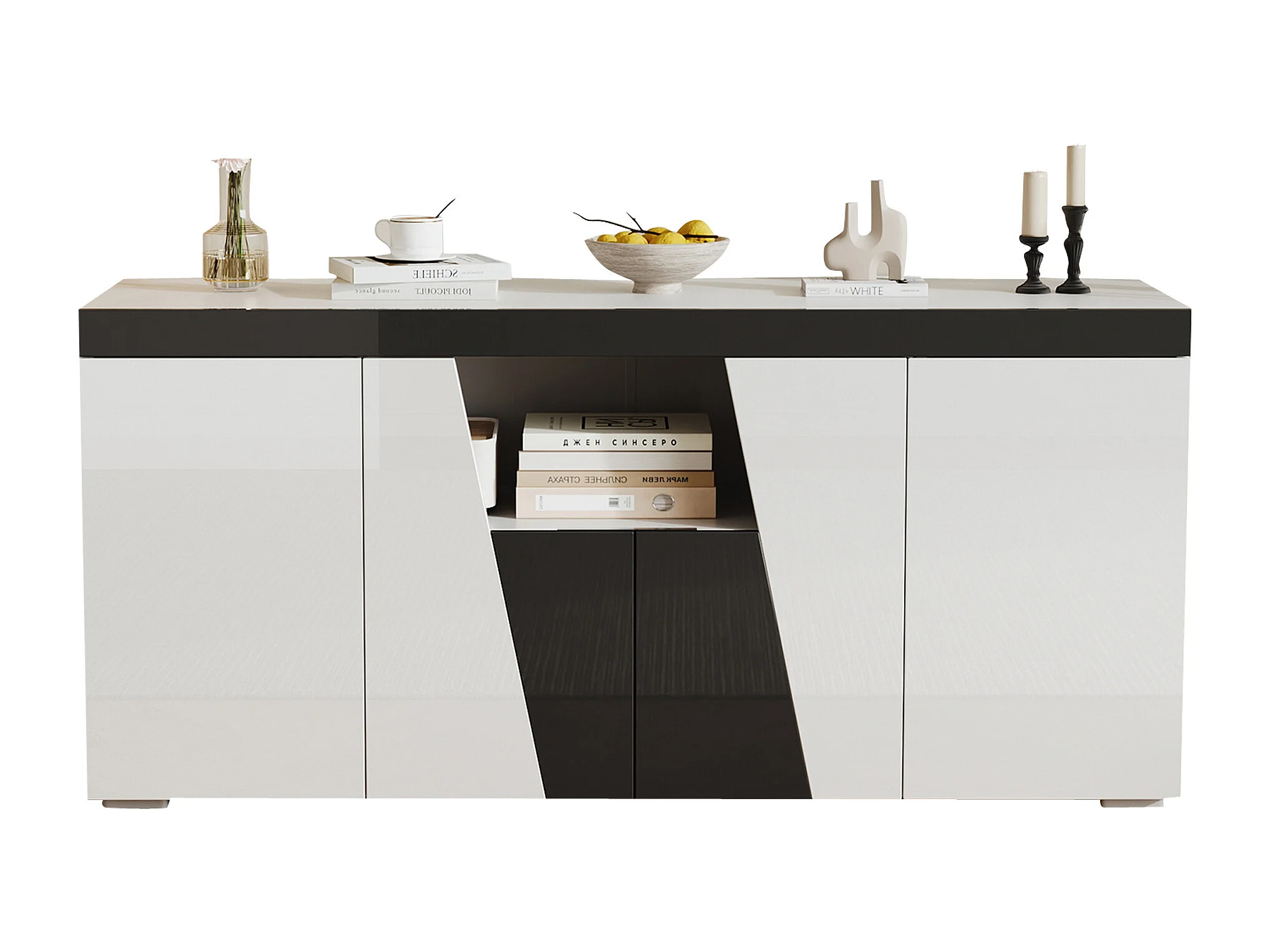 Buffet 140x40x65 cm - met 4 deuren - met LED-verlichting - Deeltjesplaten - Wit + Zwart