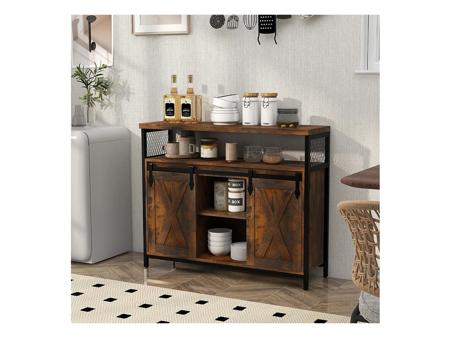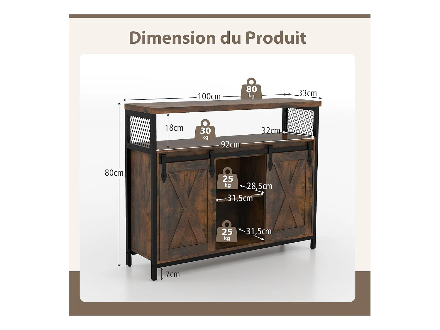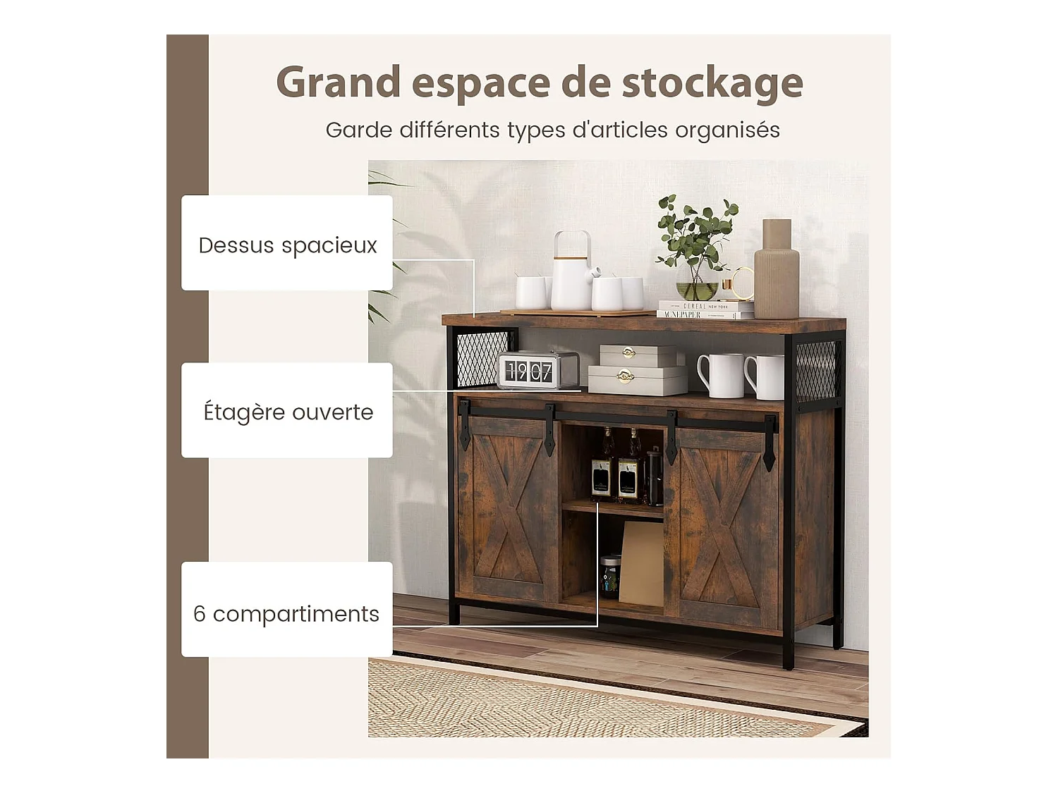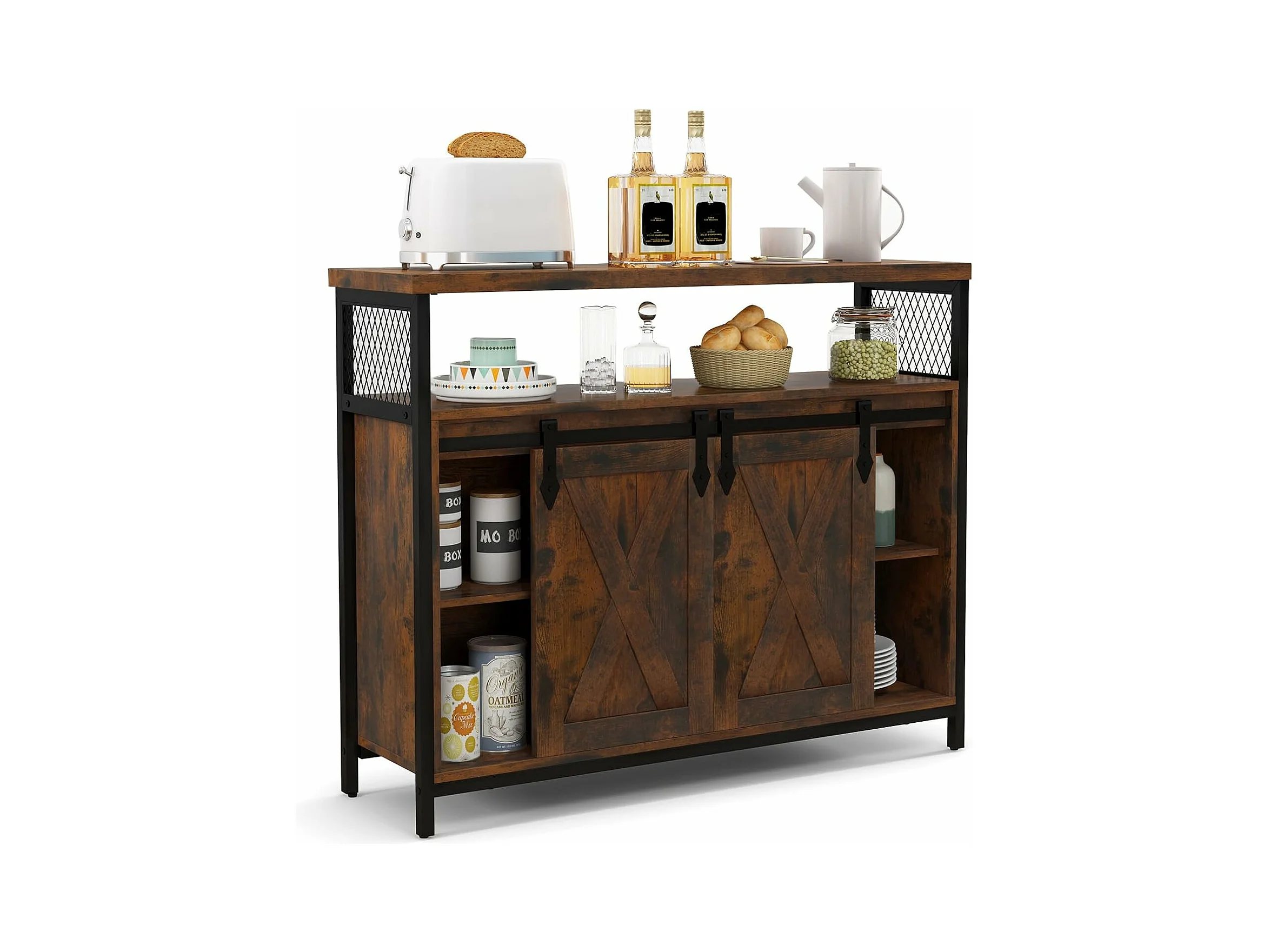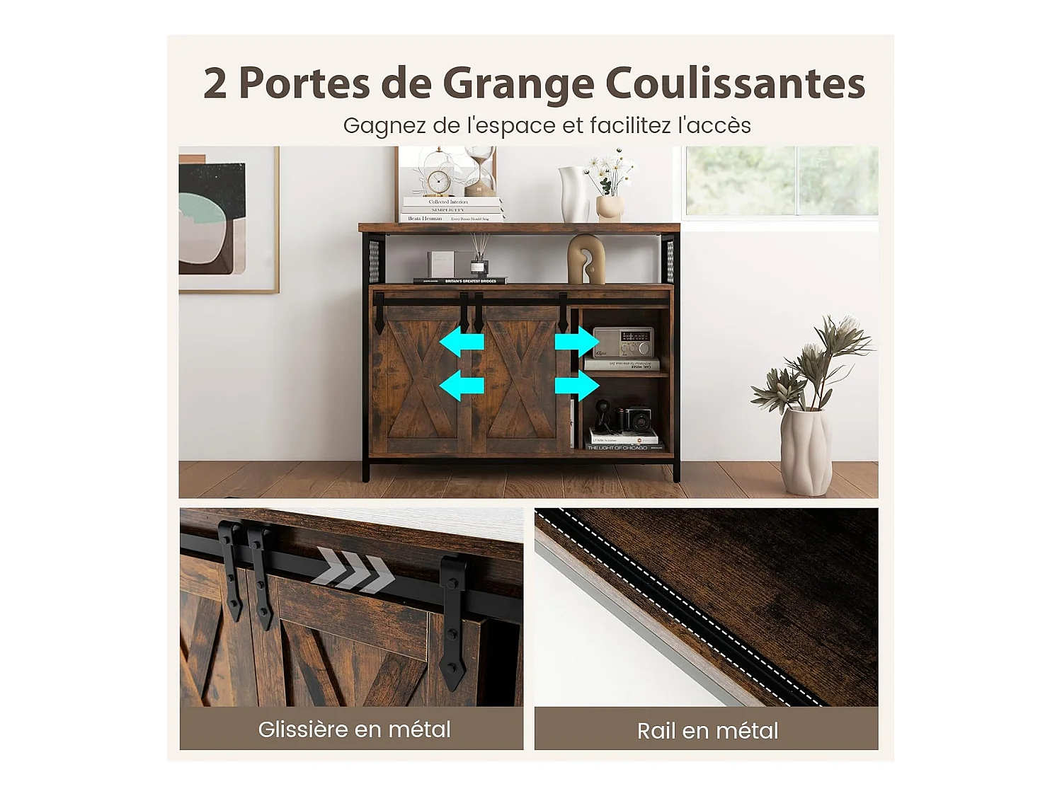 Buffet cuisine, avec 2 portes grange coulissante, 100x33x80 cm, 6 compartiments