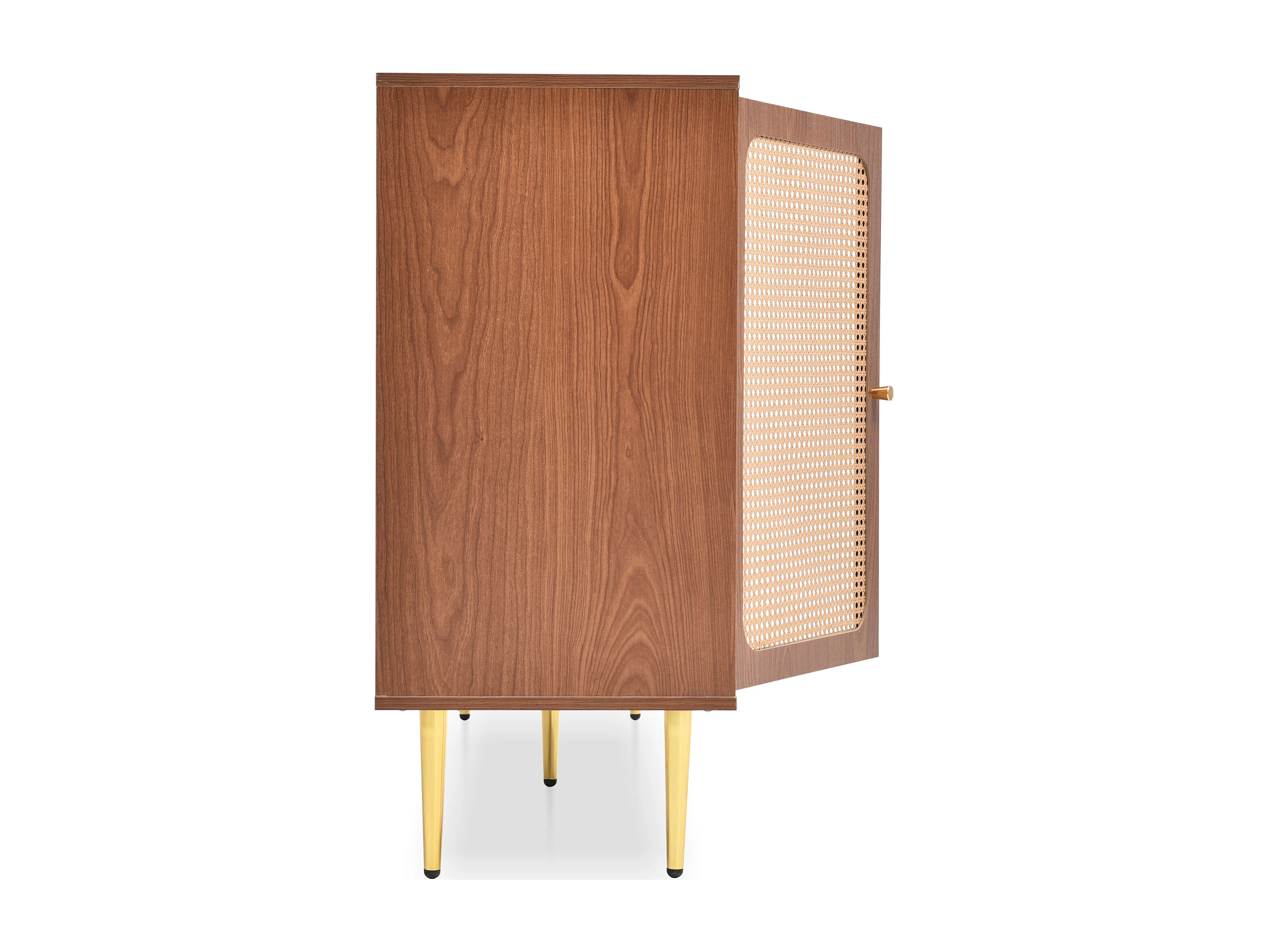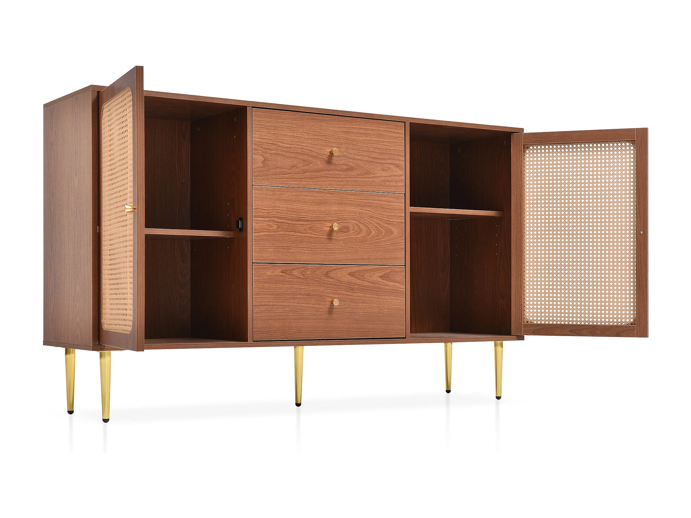 Buffetkast met 3 laden en 2 deuren in rotan, poten van goudkleurig metaal - Kleur walnoot