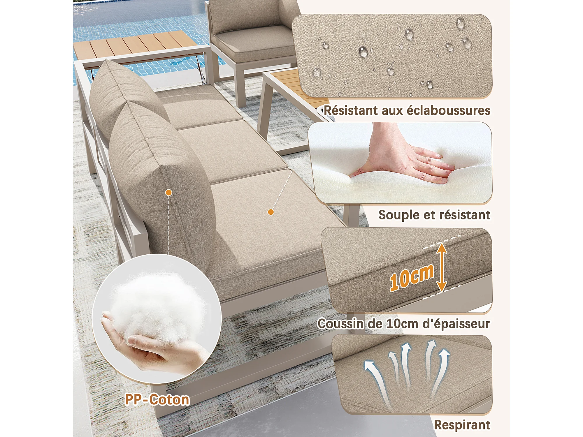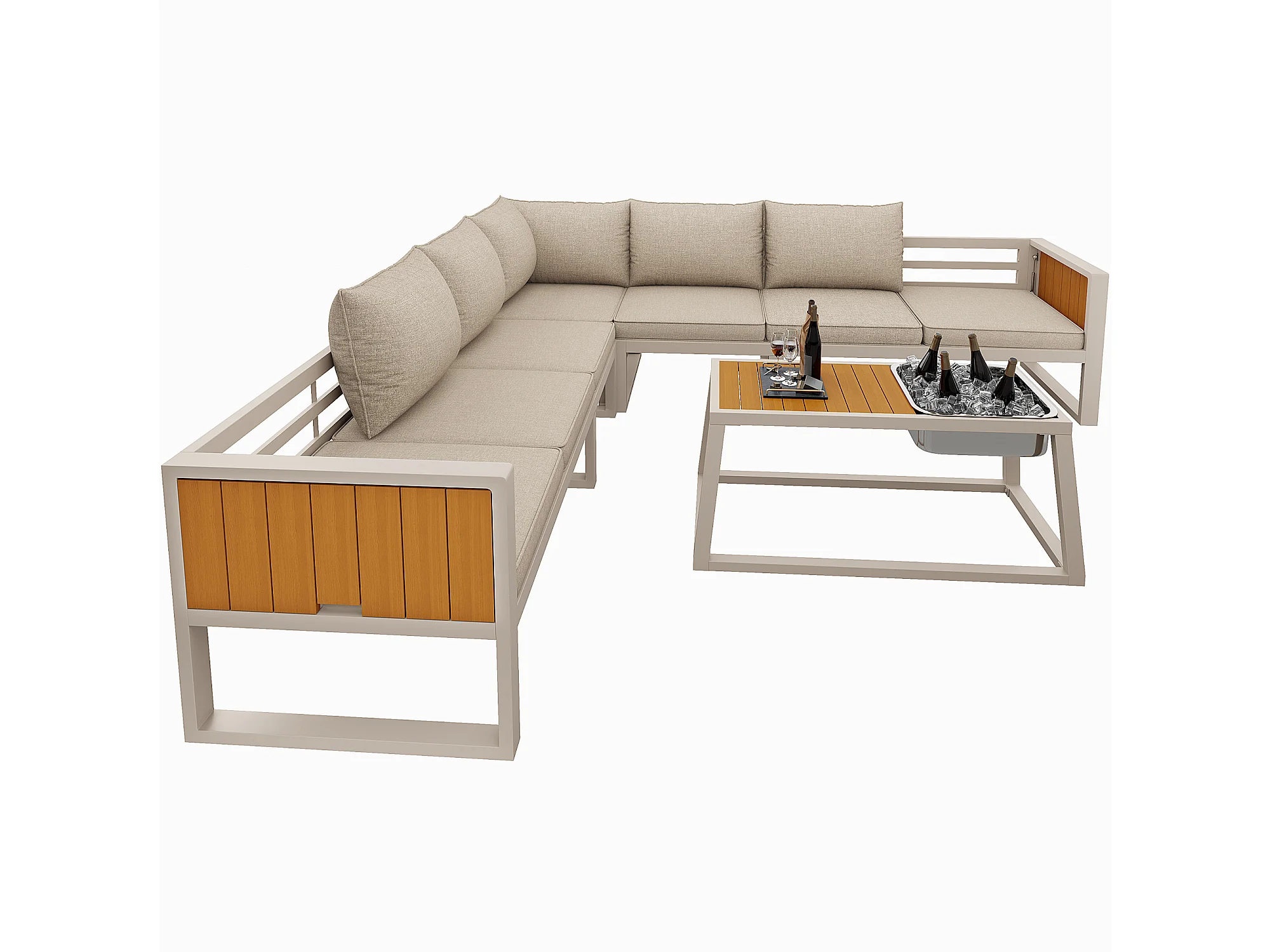 Buitenbank met verstelbare rugleuning, neerklapbare armleuningen en metalen ijsemmer, kussens van 10 cm dik, beige