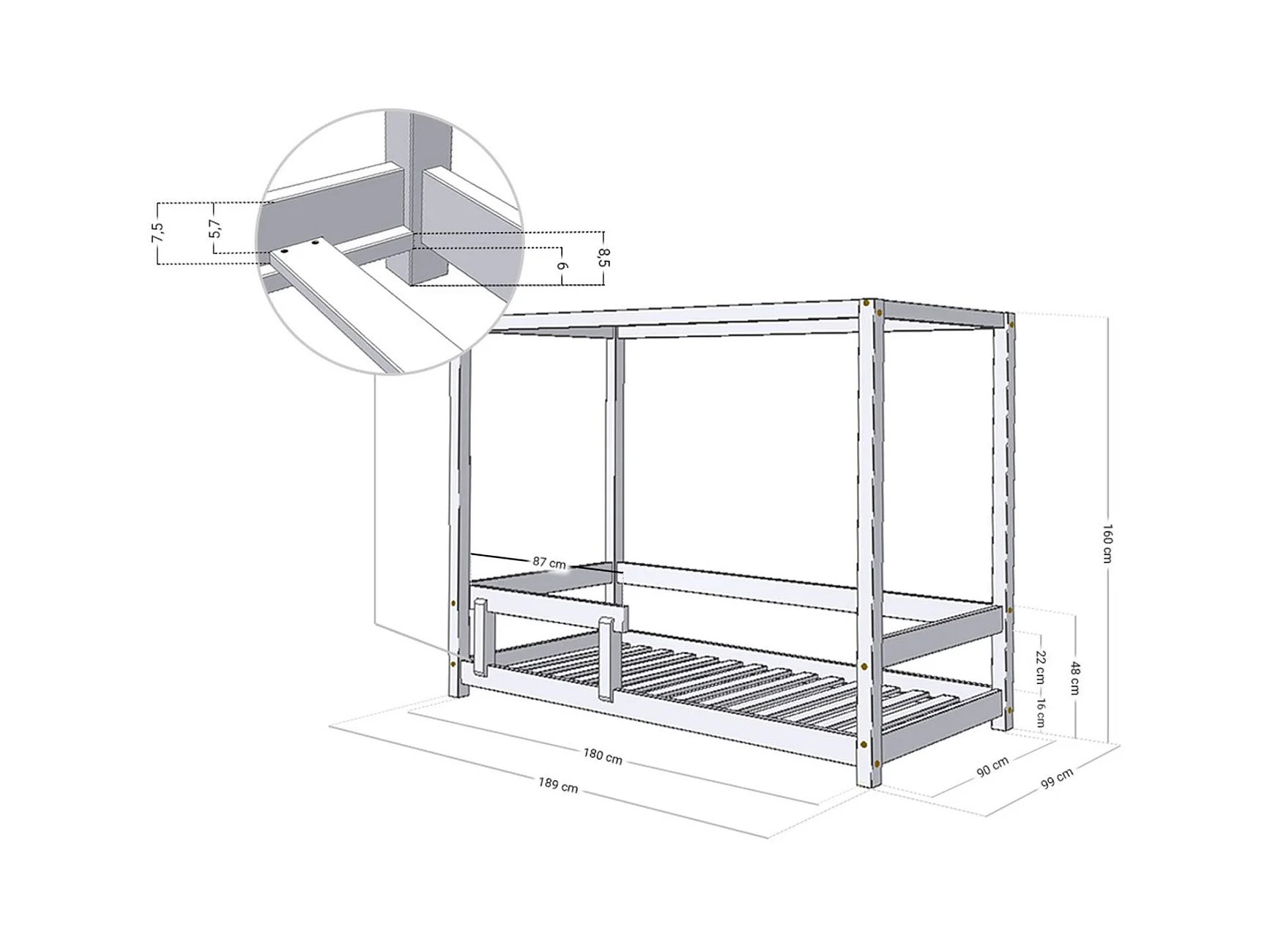 Kajuitbed met plank 90 x 180 naturel en grijs