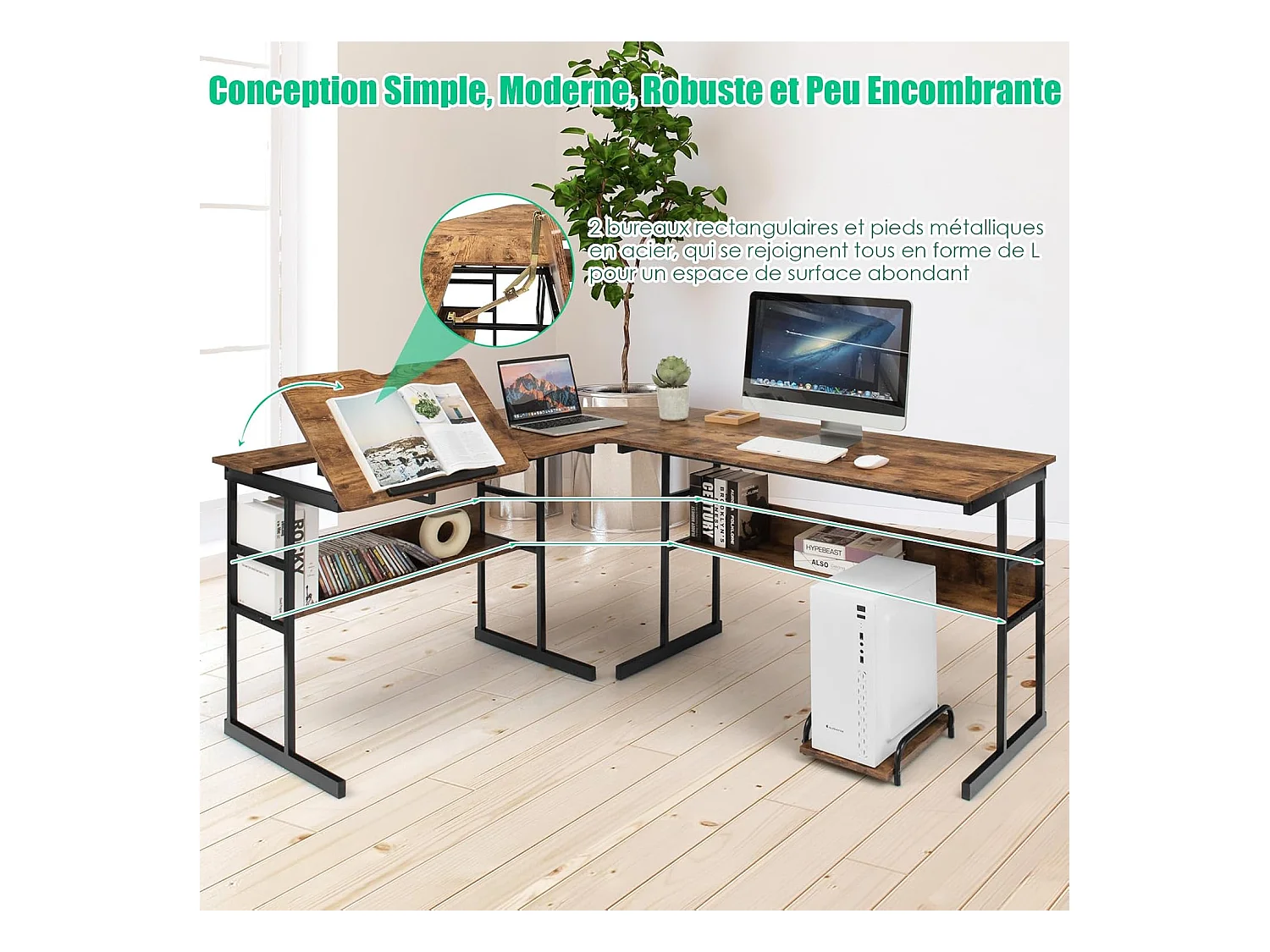 Bureau d'Ordinateur d'angle 170 x 150 cm, Table de Bureau avec Plateau Inclinable, Étagère Inférieure, Support UC, Poste de Travail pour Bureau, Studio (Marron)