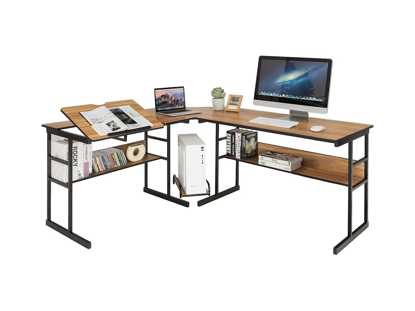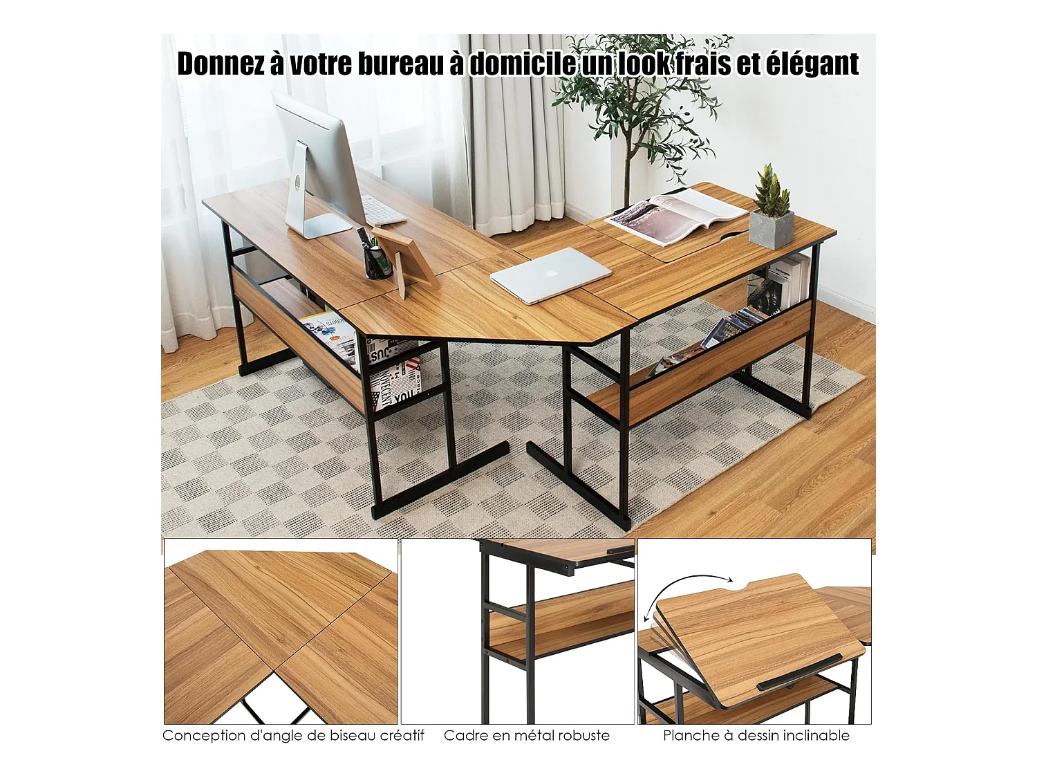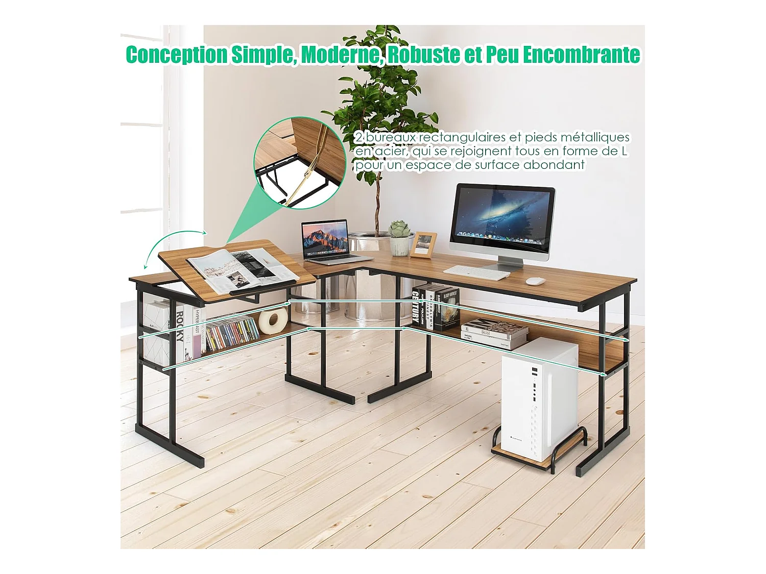 Bureau d'Ordinateur d'angle 170 x 150 cm, Table de Bureau avec Plateau Inclinable, Étagère Inférieure, Support UC, Poste de Travail pour Bureau, Studio (Noyer)