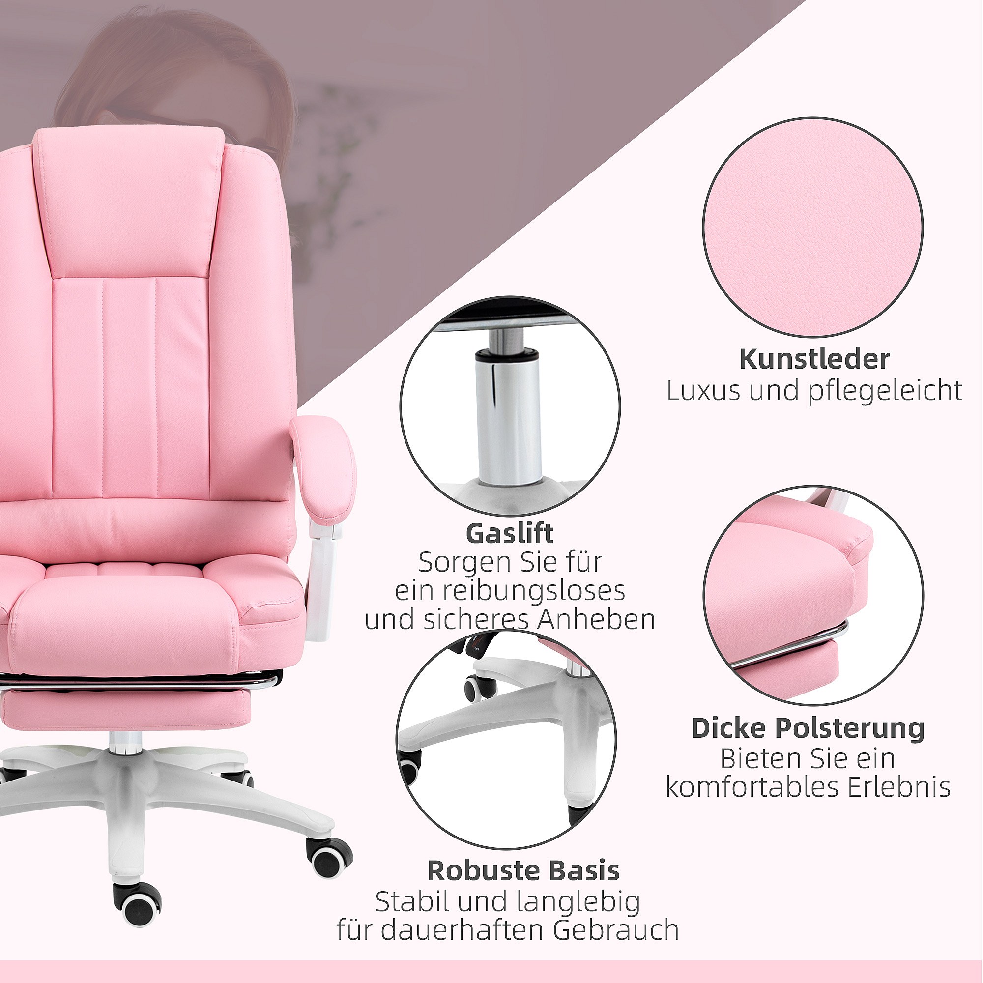 Bureaustoel met voetenbankje, relaxfunctie, wieltjes, in hoogte verstelbaar, roze imitatieleer, ideaal voor op kantoor of thuiskantoor
