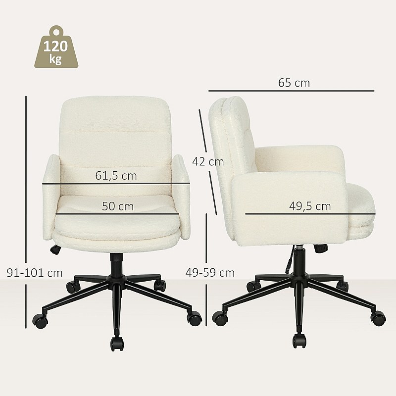 Bureaustoel met wielen, 360° draaibaar, met armleuningen, ademende stof, 5 stevige wielen, elegant design, witte kleur, comfortabel en praktisch