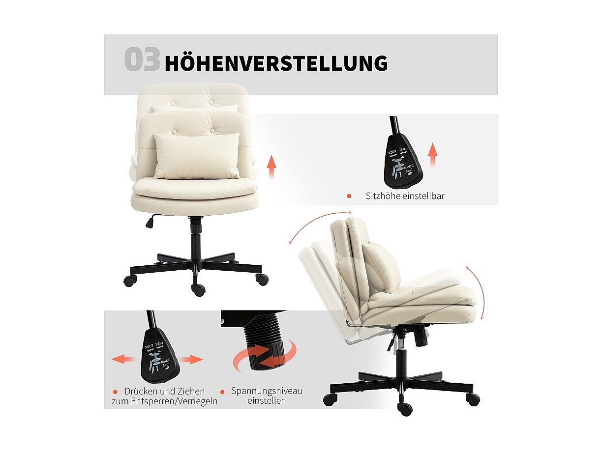 Bureaustoel zonder armleuningen in imitatieleer, zitting met wielen en extra kussen, in hoogte verstelbaar, beige kleur, praktisch en comfortabel
