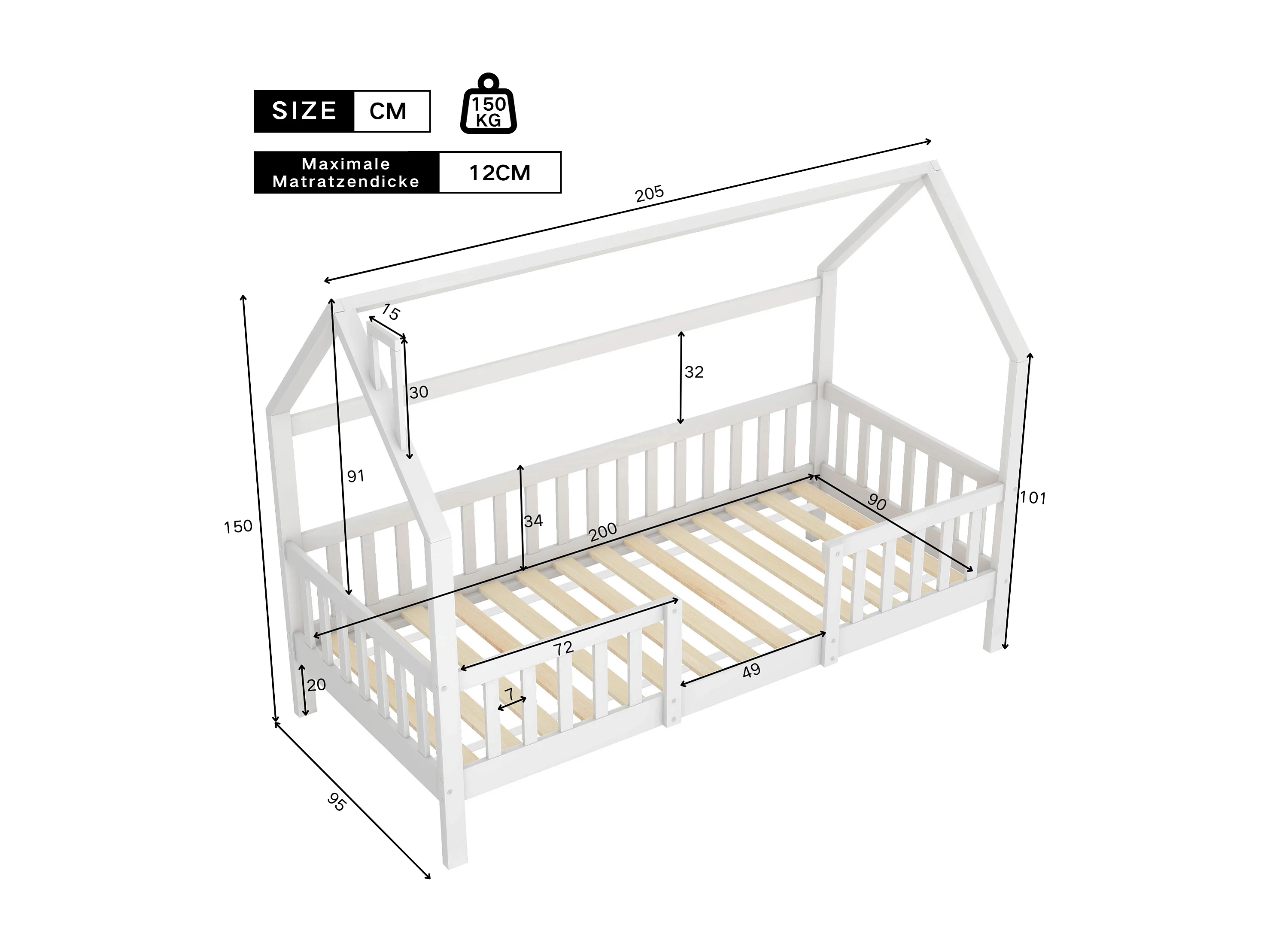 Kajuitbed 90 x 200 cm in grenenhout voor kinderen met lattenbodem en witte veiligheidsbarrière