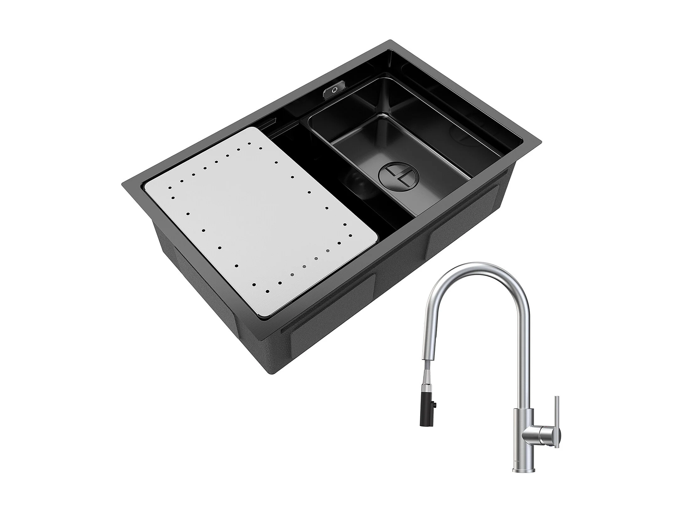 CECIPA MAX 1 spoelbak 70×44CM zwarte spoelbak met afdruiprek en wastafel + keukenmengkraan met uittrekbare spray, 2 waterafvoermodi, geborsteld