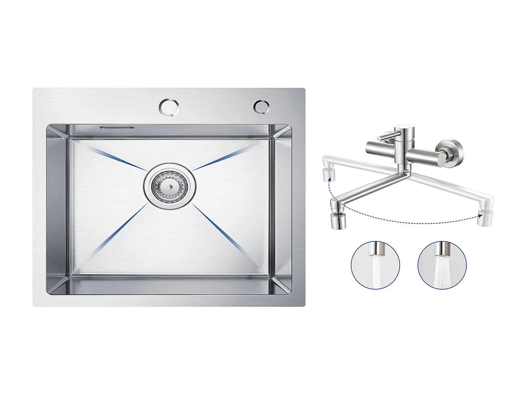 Cecipa max roestvrijstalen spoelbak 1 bak spoelbak 50 × 45 cm geborstelde spoelbak + mengkraan met uittrekbare straal, 3 waterafvoermodi, geborsteld