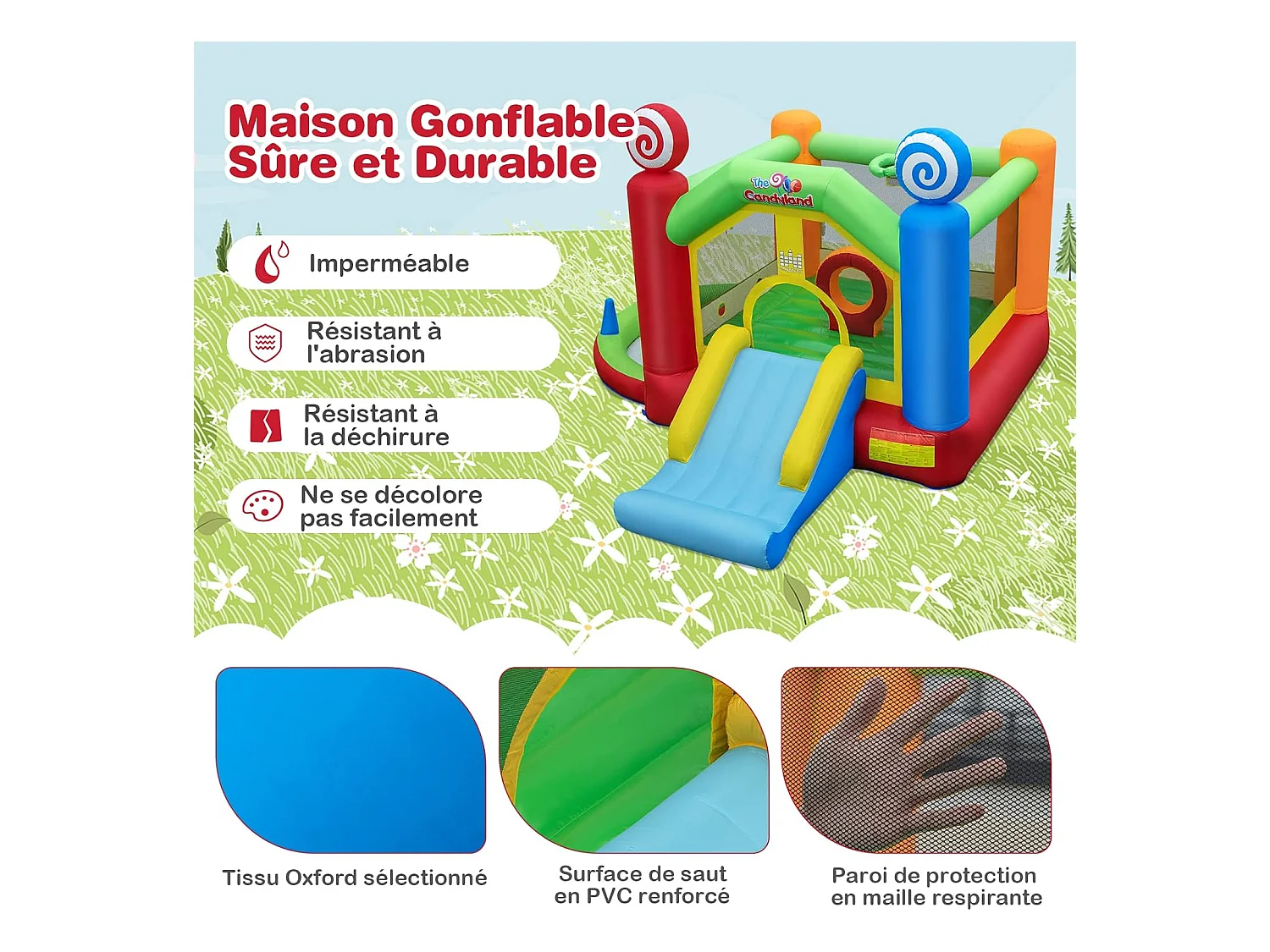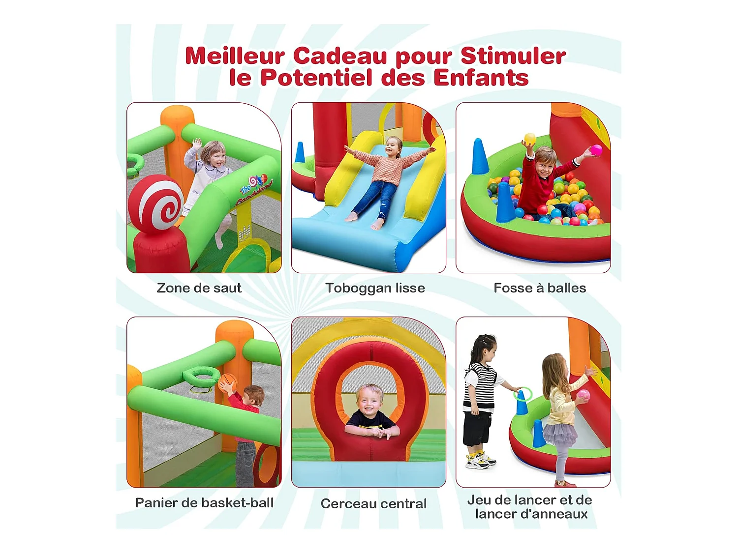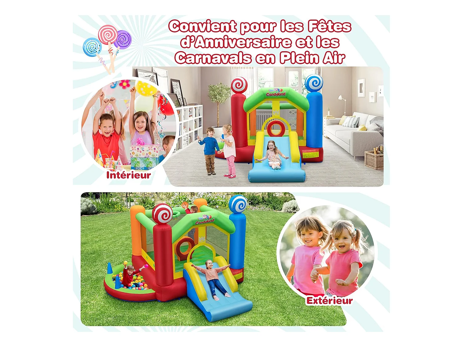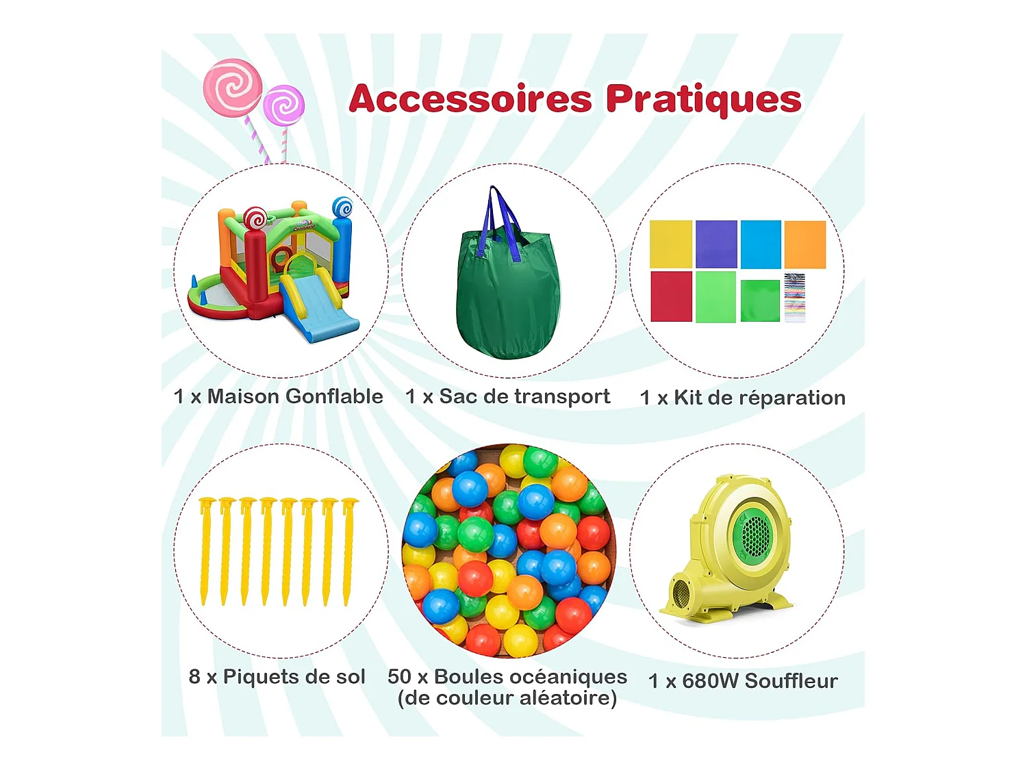 Opblaasbaar kasteel met 680W-blazer, gigantisch binnen- en buitenspringhuis met glijbaan, lollyversieringen, 50 oceaanballen, basketbalring voor kinderen vanaf 3 jaar