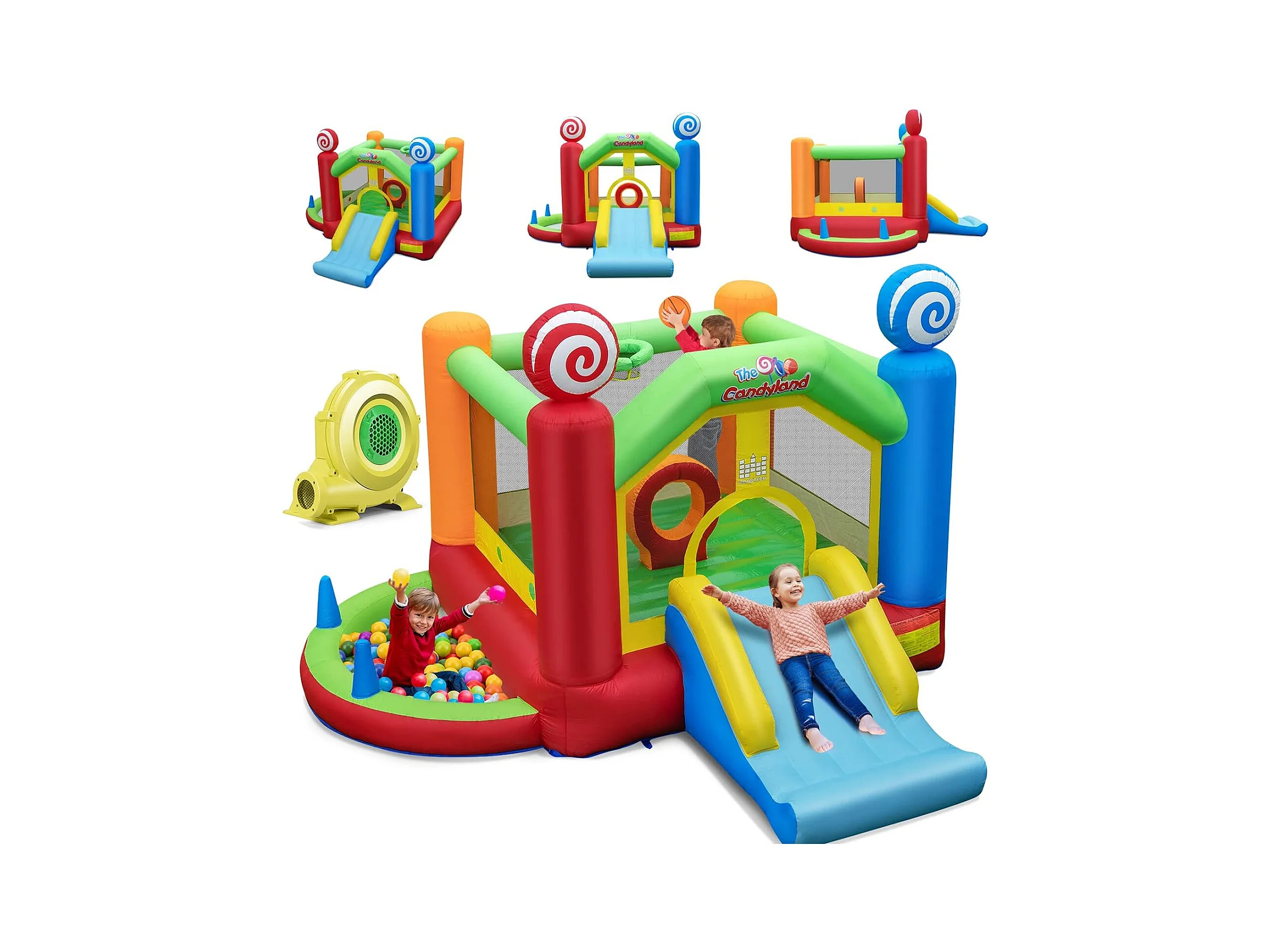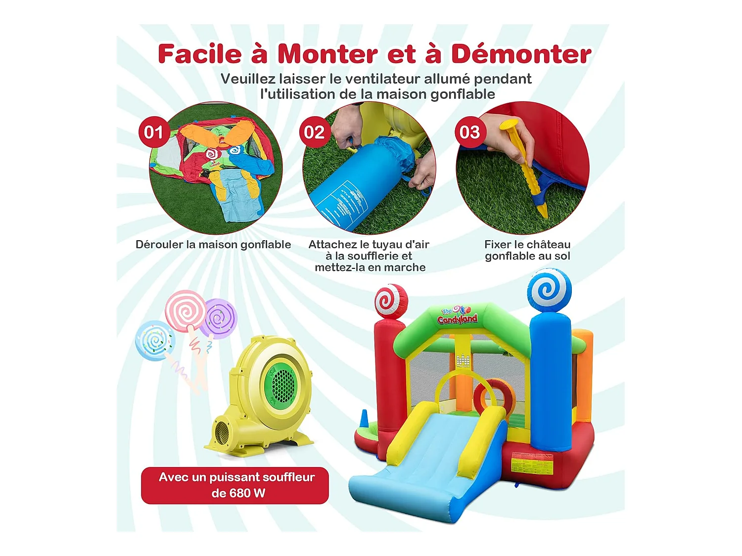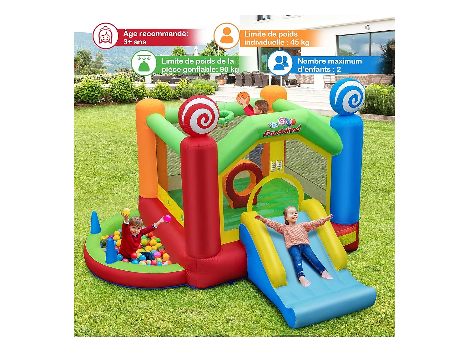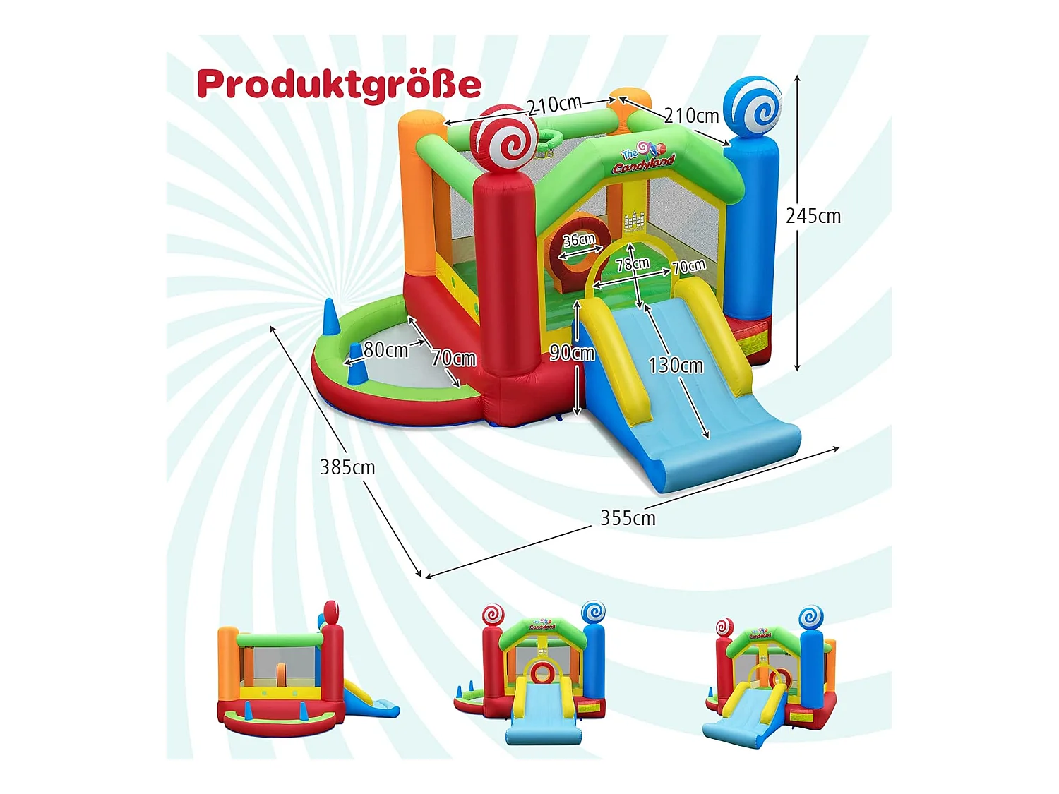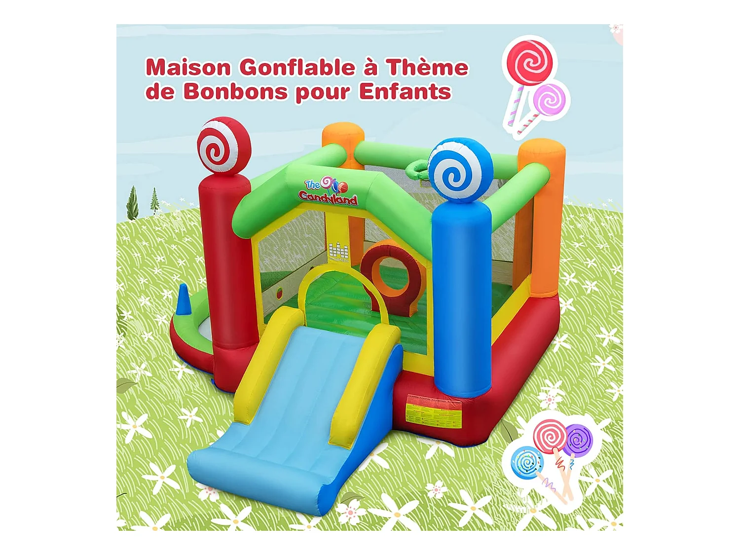 Opblaasbaar kasteel met 680W-blazer, gigantisch binnen- en buitenspringhuis met glijbaan, lollyversieringen, 50 oceaanballen, basketbalring voor kinderen vanaf 3 jaar