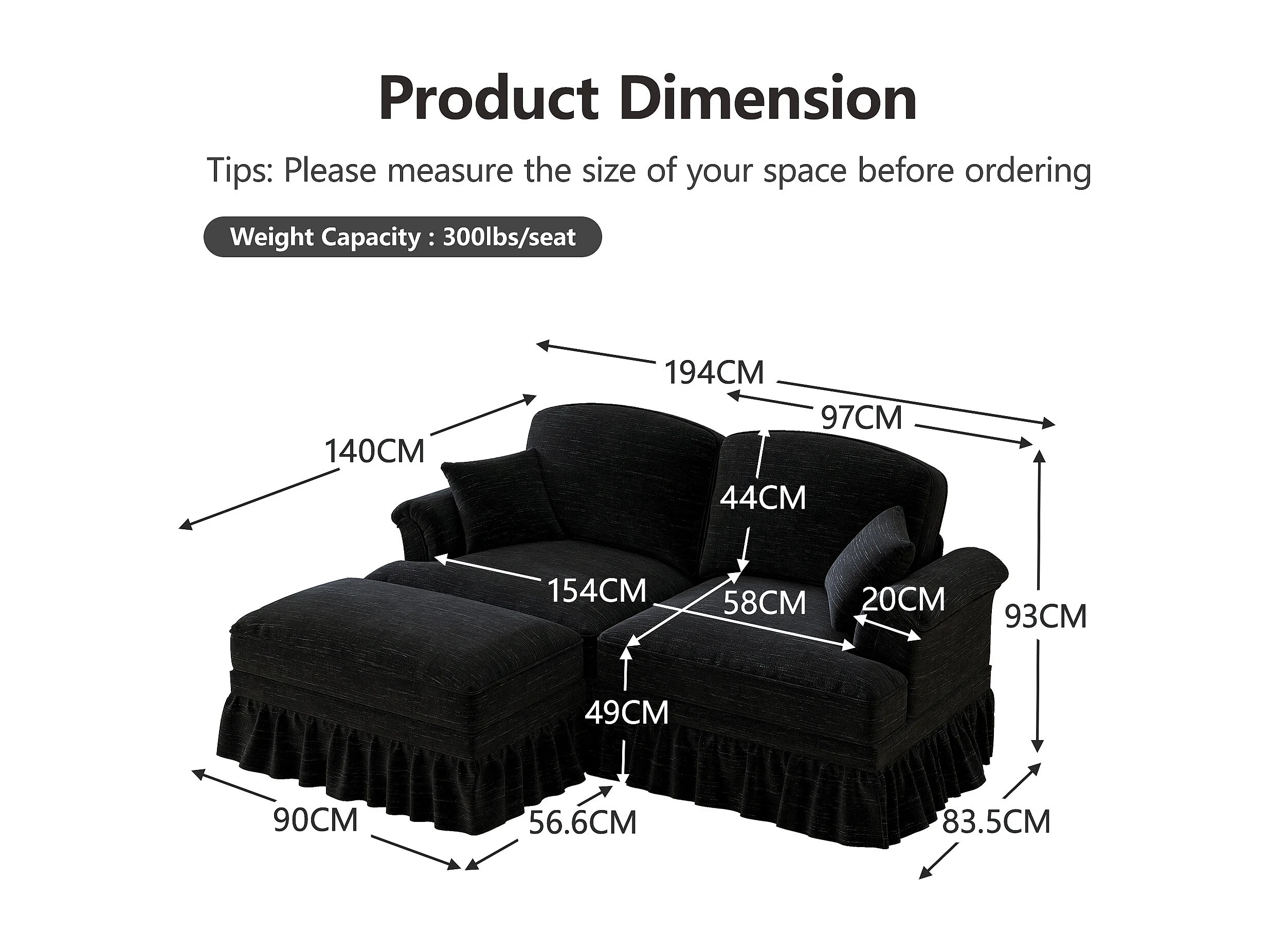 Chesterfield bank 2-zits in chenille zwart - met poef en 2 kussens - afneembare ruche - 194x140x93cm