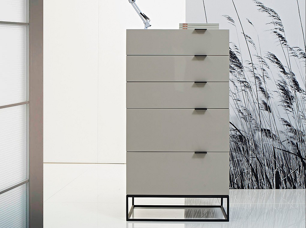 Opbergmeubel met 5 grijs gelakte houten lades en Dyn poten van gehard glas