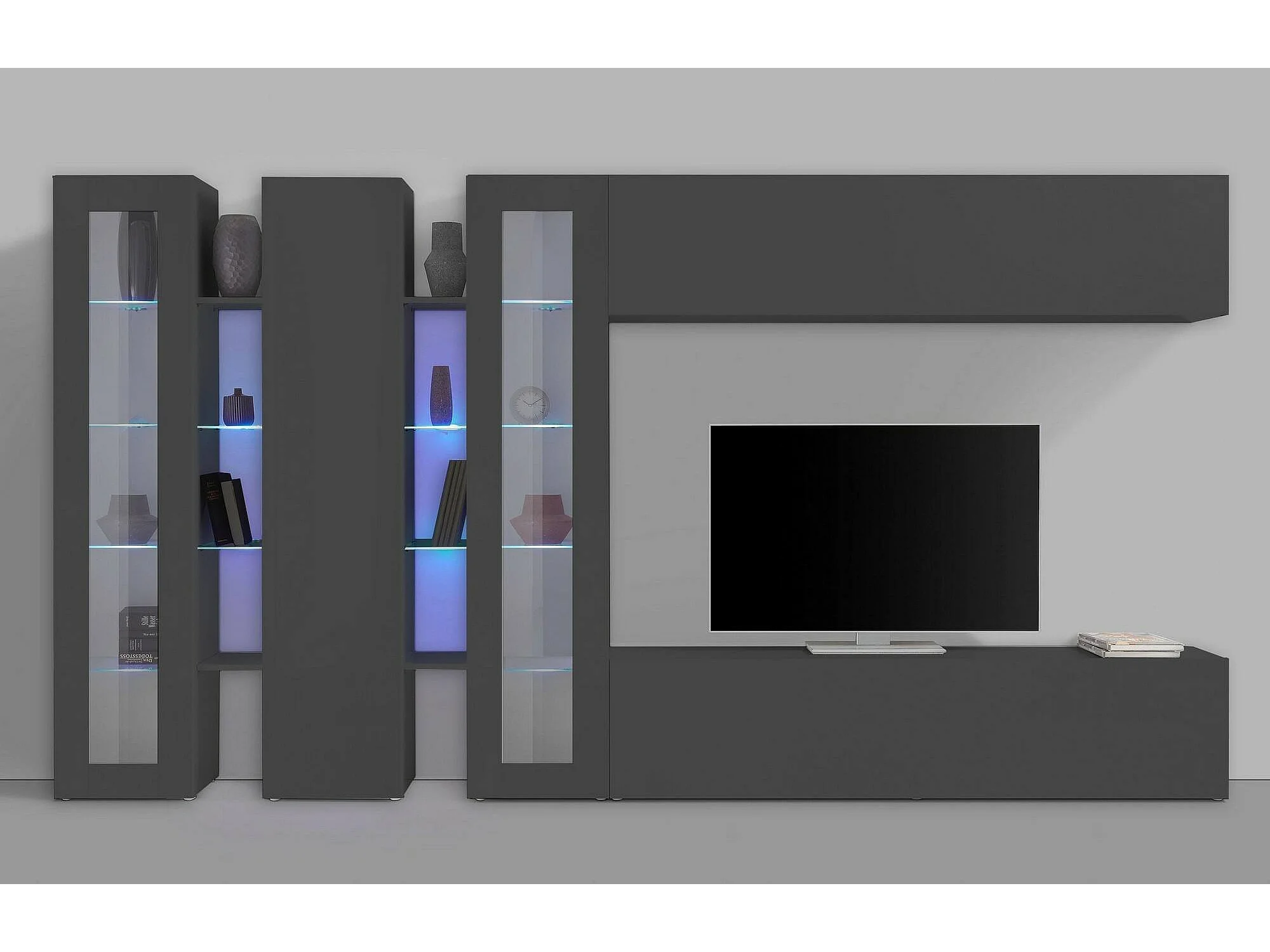Dmora Wandmeubel Clemente 30x340x180h cm Antraciet 22 Planken Draaideuren en Kleppen, 5 Deuren Made in Italy