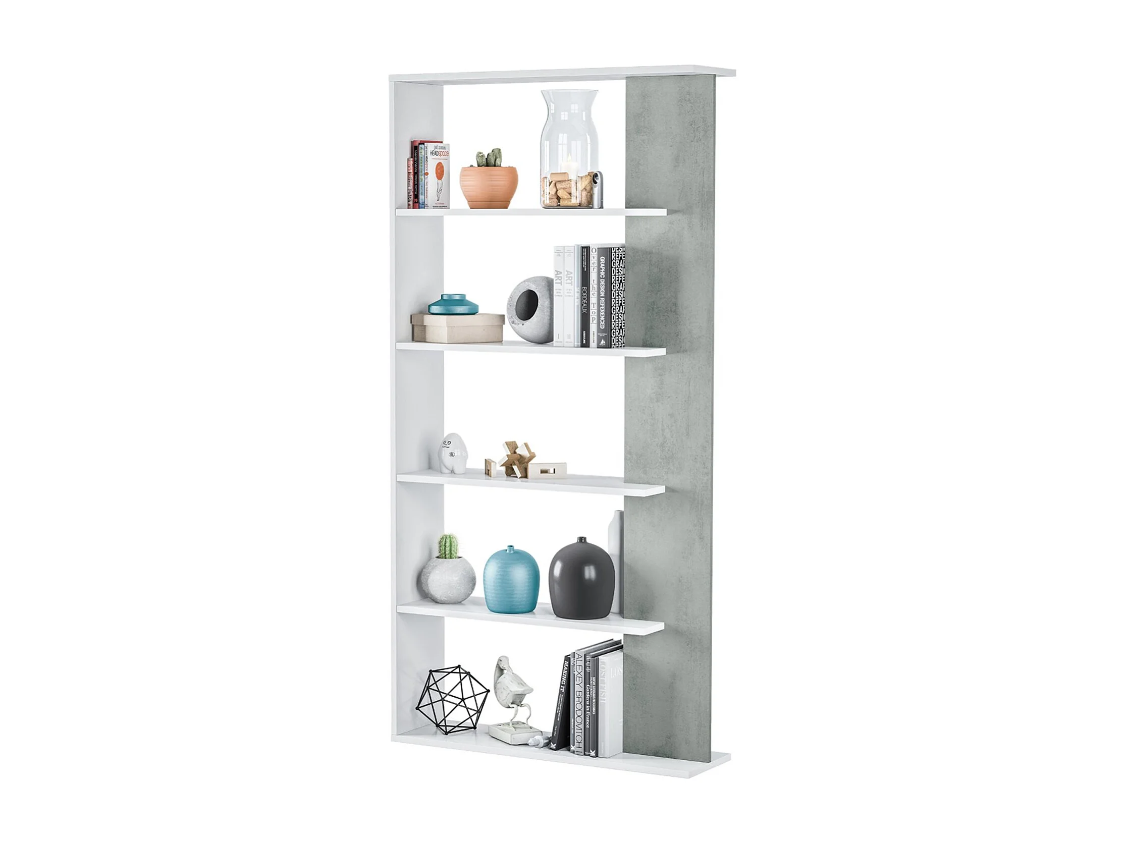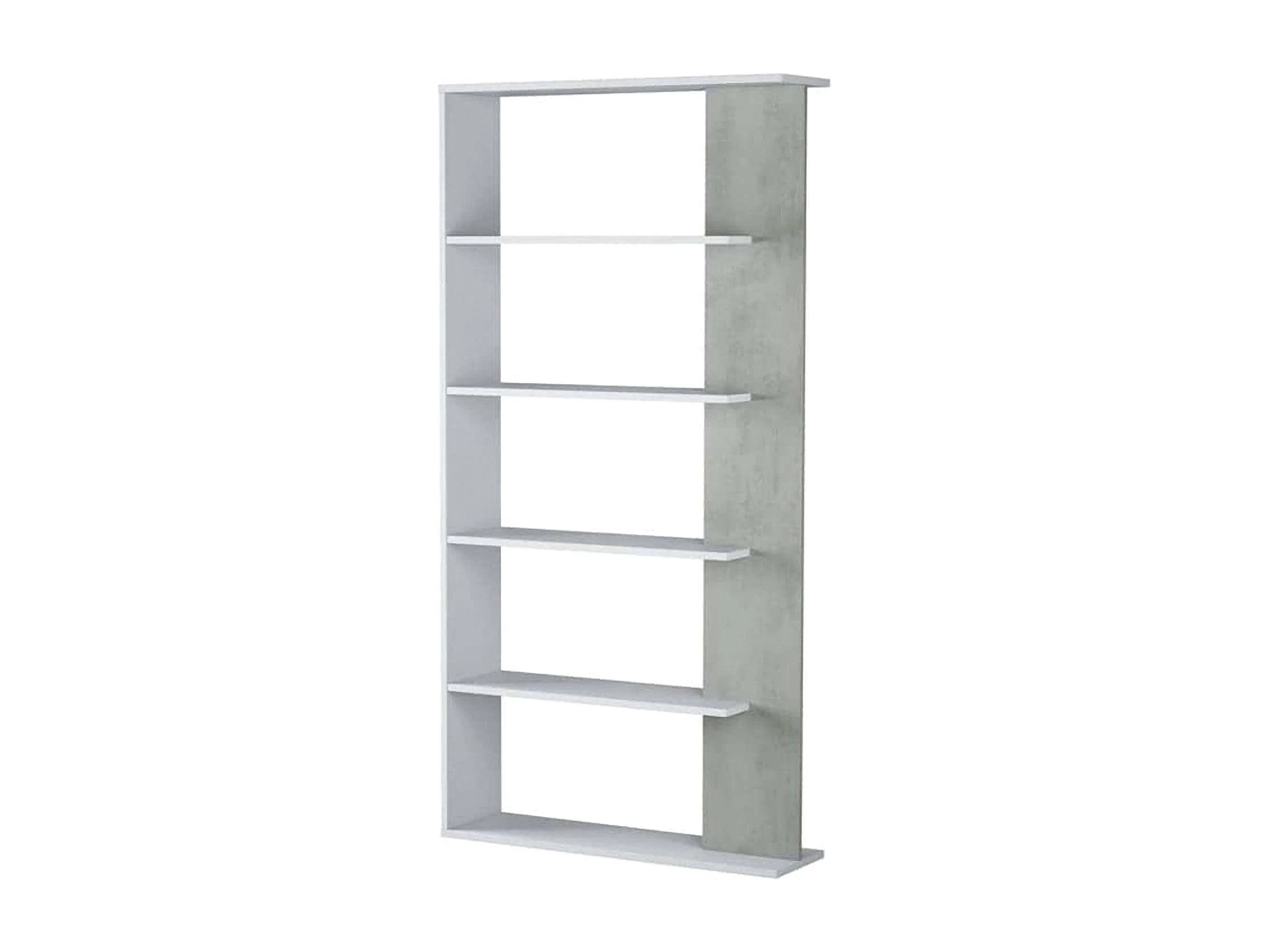 Columbia Boekenkast, Dubbelzijdige boekenkast met 5 planken, Verdeelplank voor kantoor of slaapkamer, 90x25h180 cm, Wit en Cement
