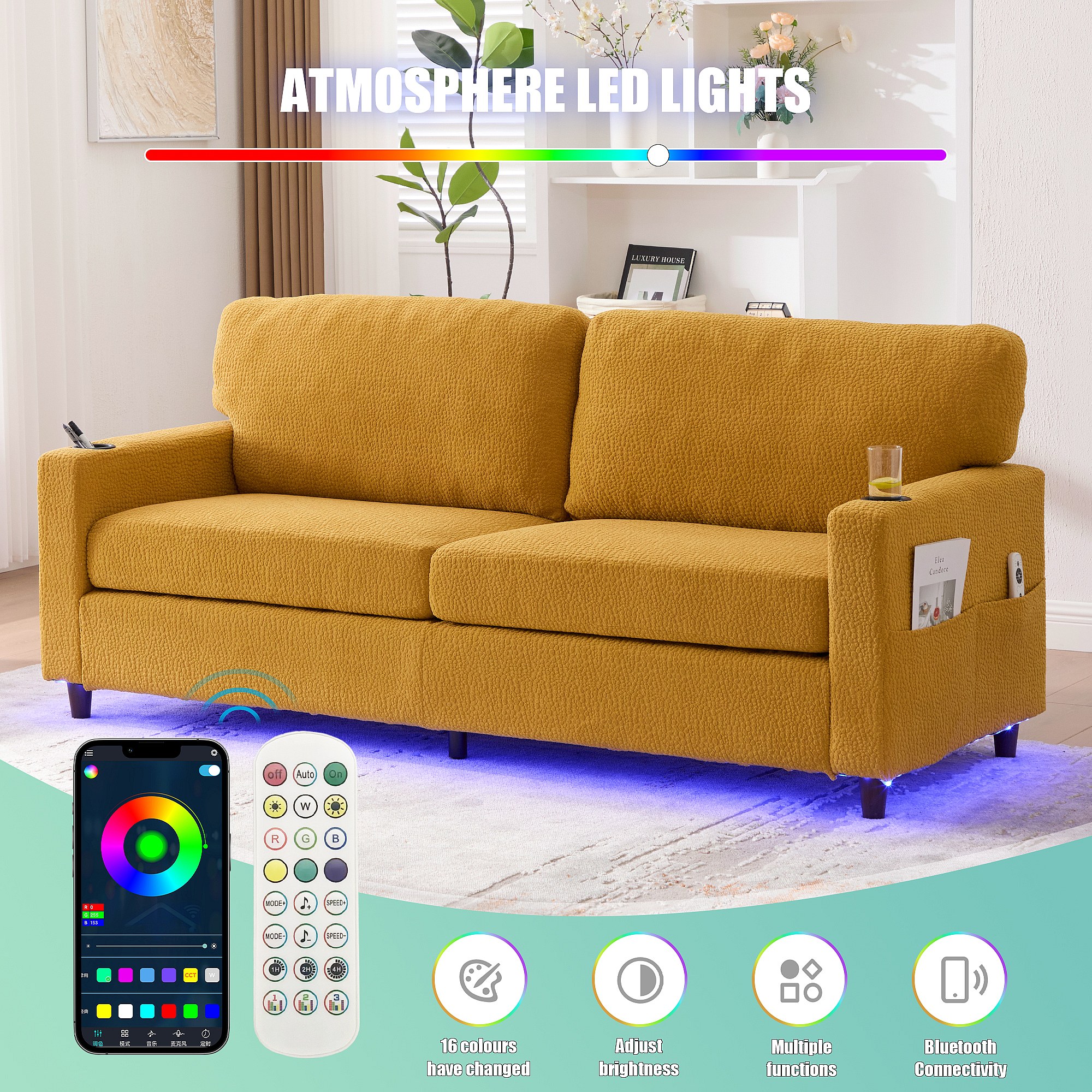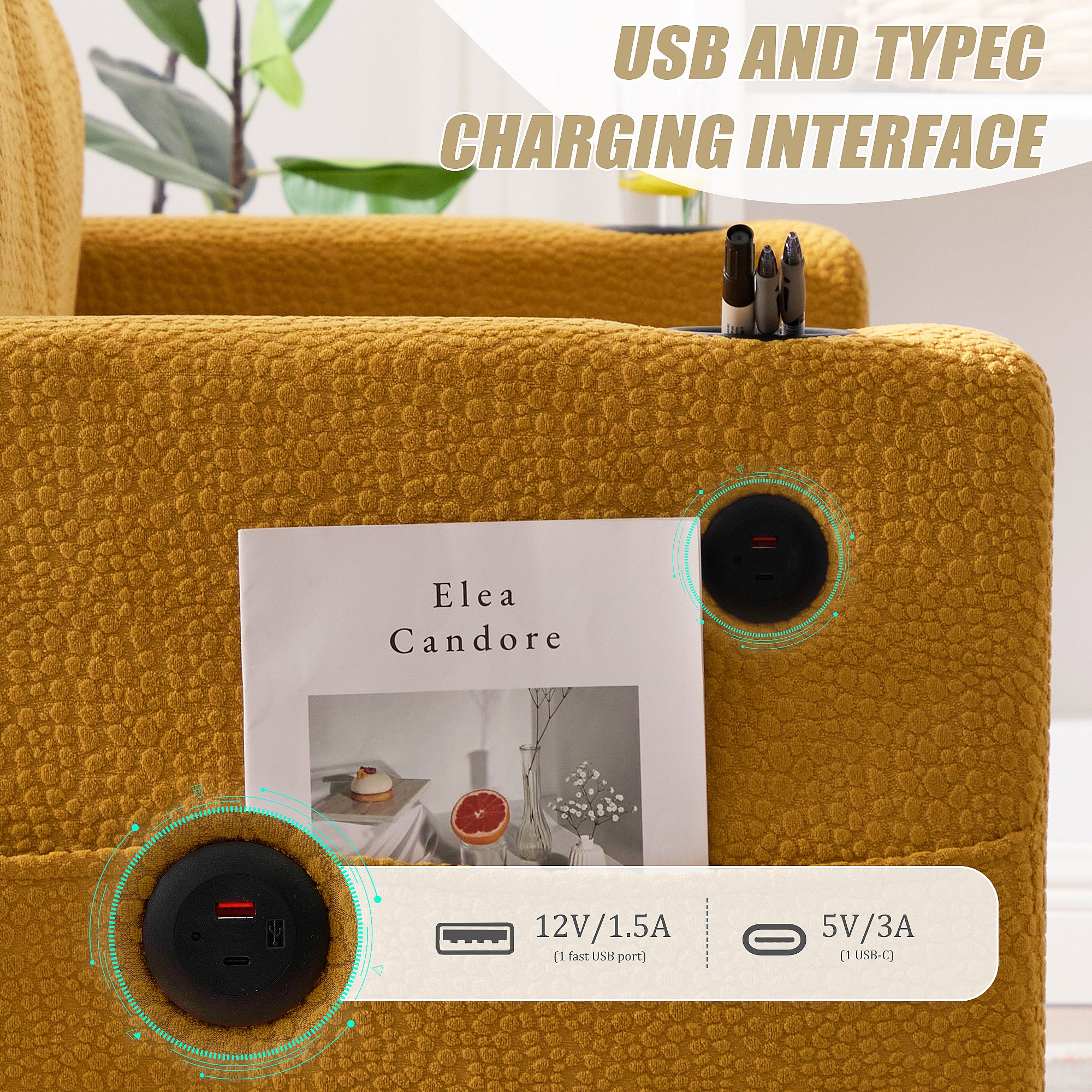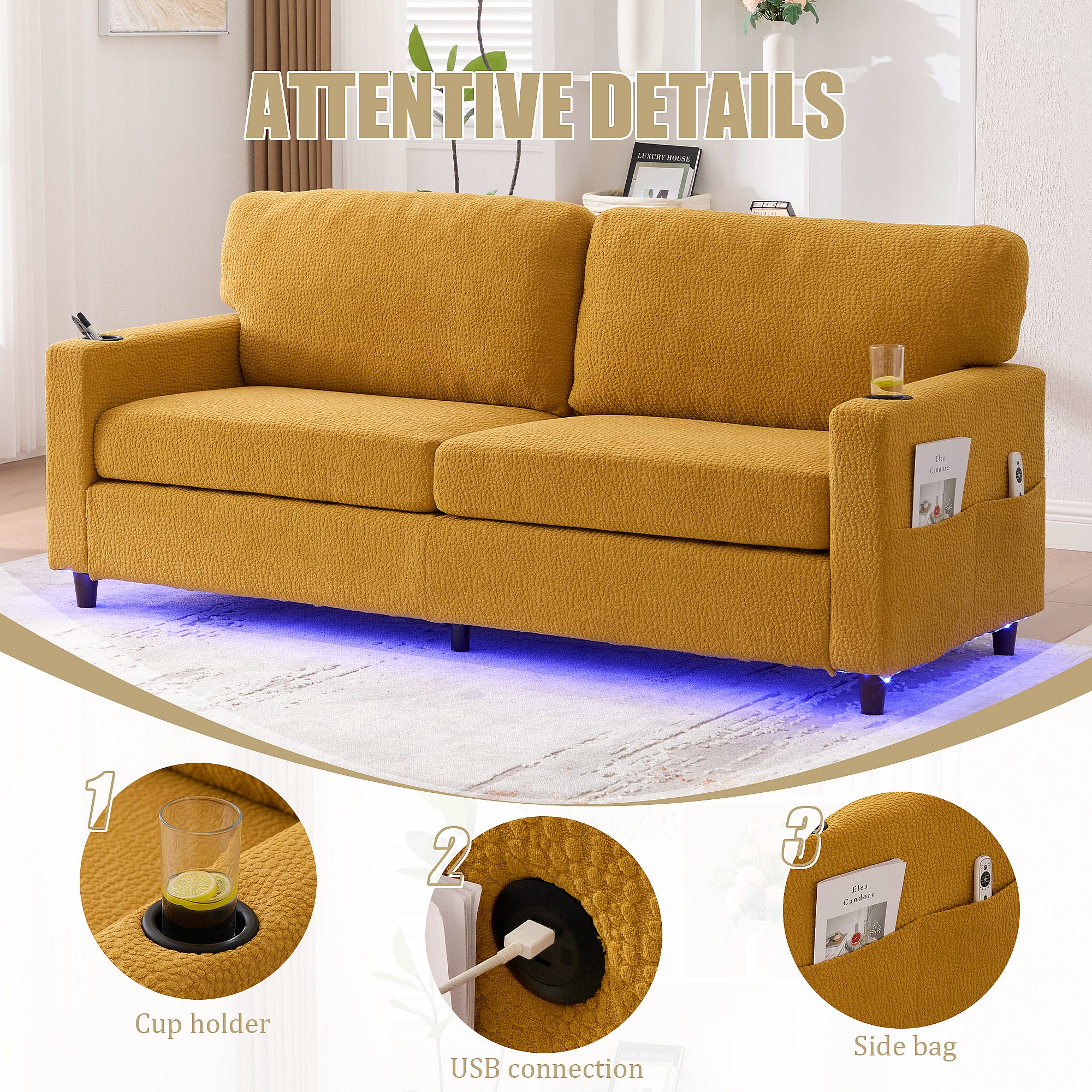 Comfortabele 2-zitsbank - Chenille Fluwelen Bank met USB/Type-C Poorten en RGB LED - Afstandsbediening - Voor Woonkamer, Lounge, Kantoor
