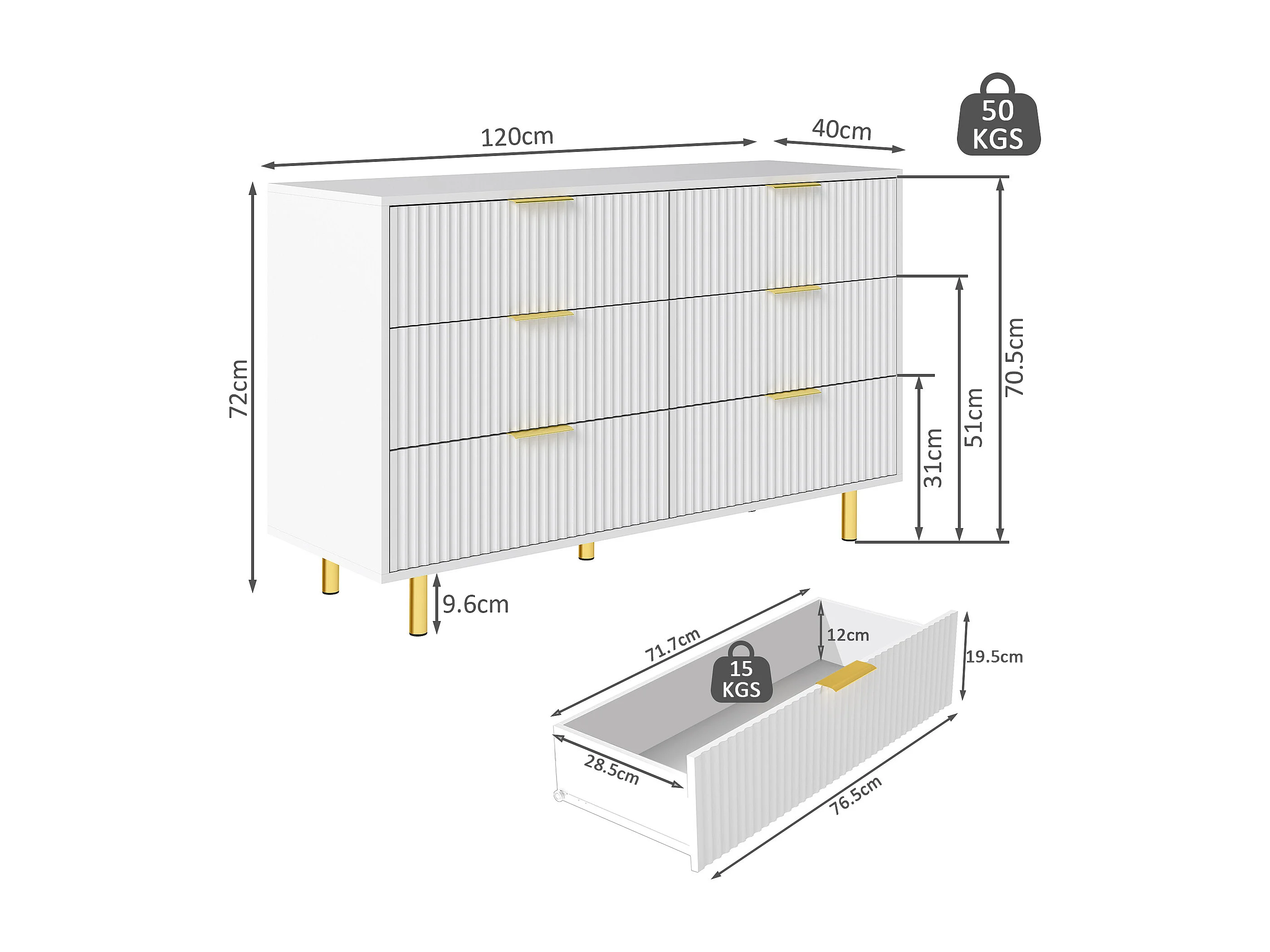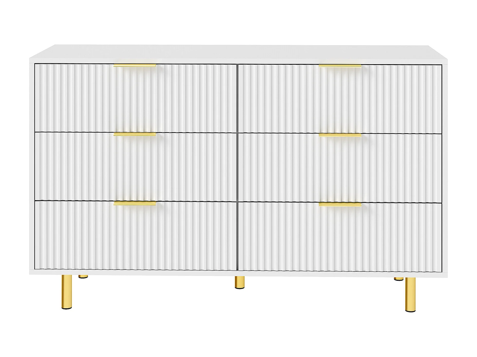 Commode met 6 lades, wit en goud, 120x40x72 cm