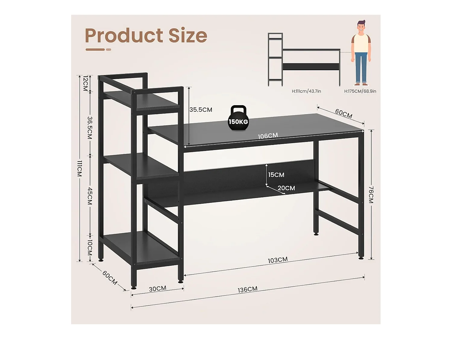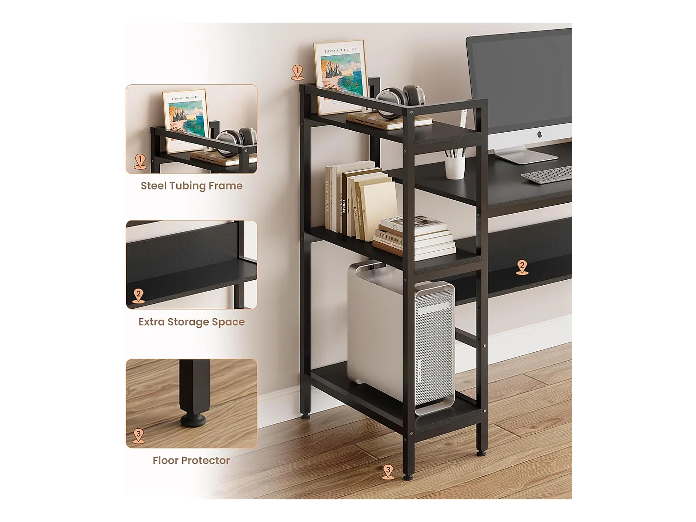 Computerbureau met opbergplanken, houten computerbureau voor slaapkamer woonkamer 136x60x111cm - zwart
