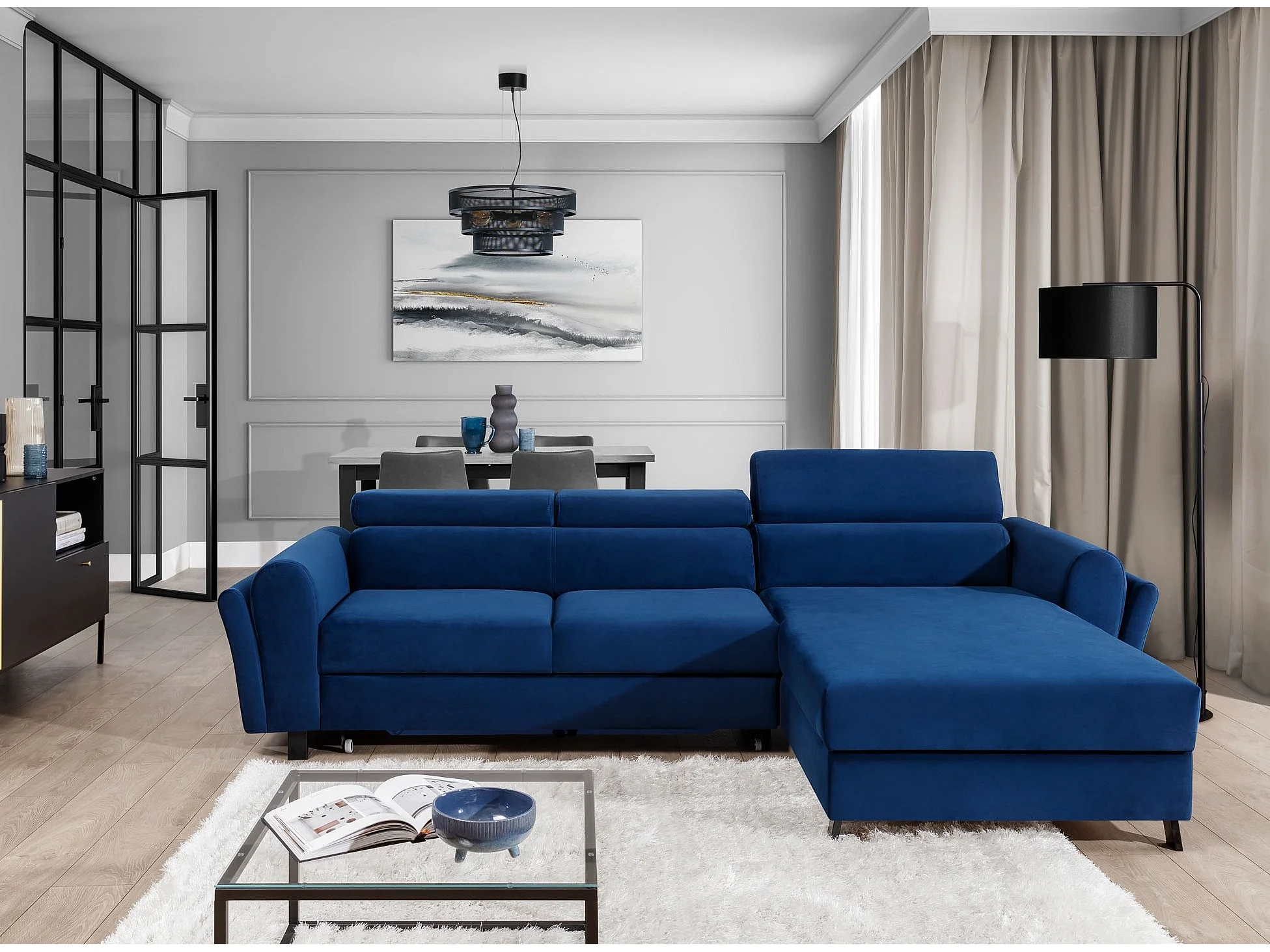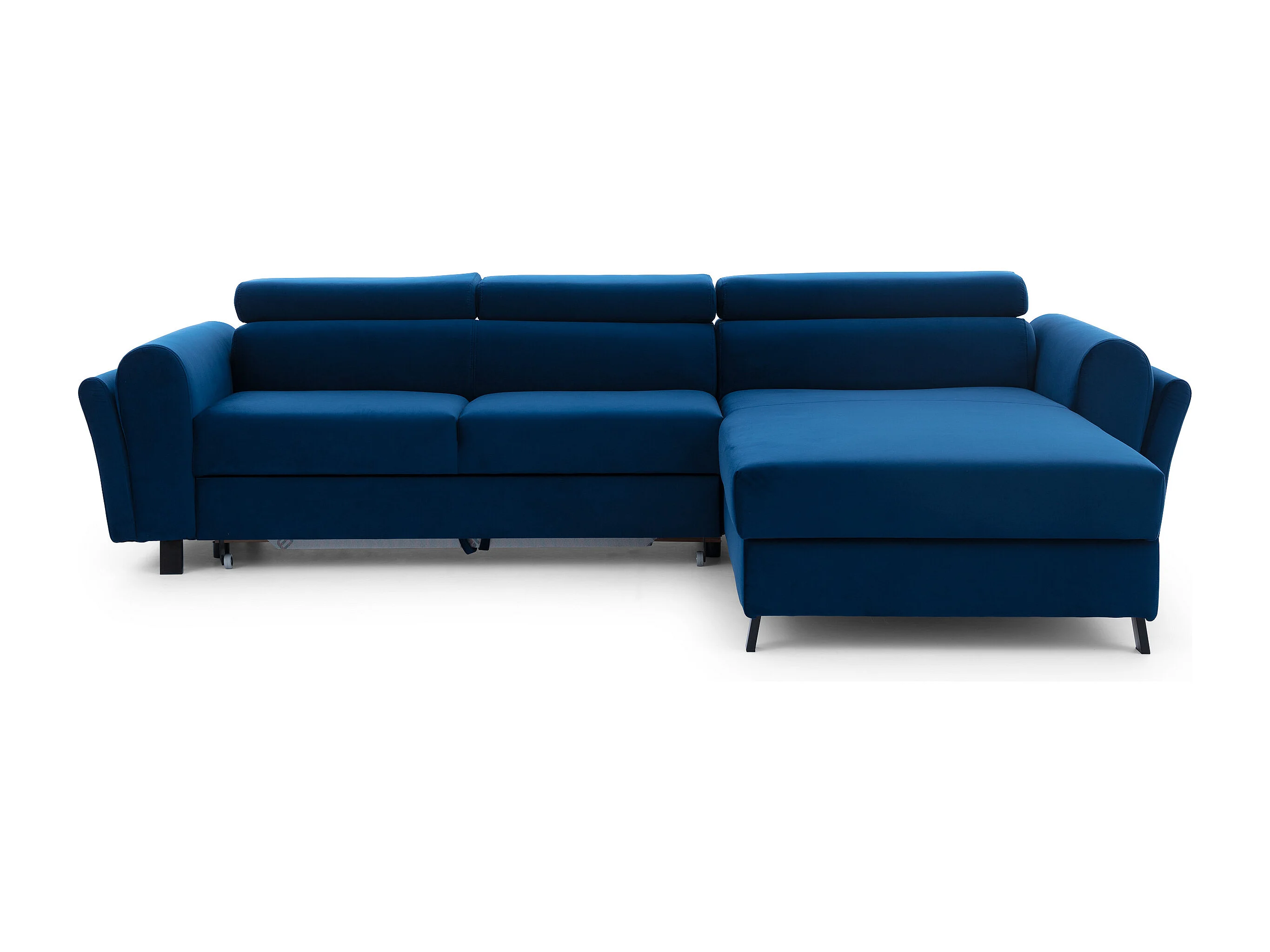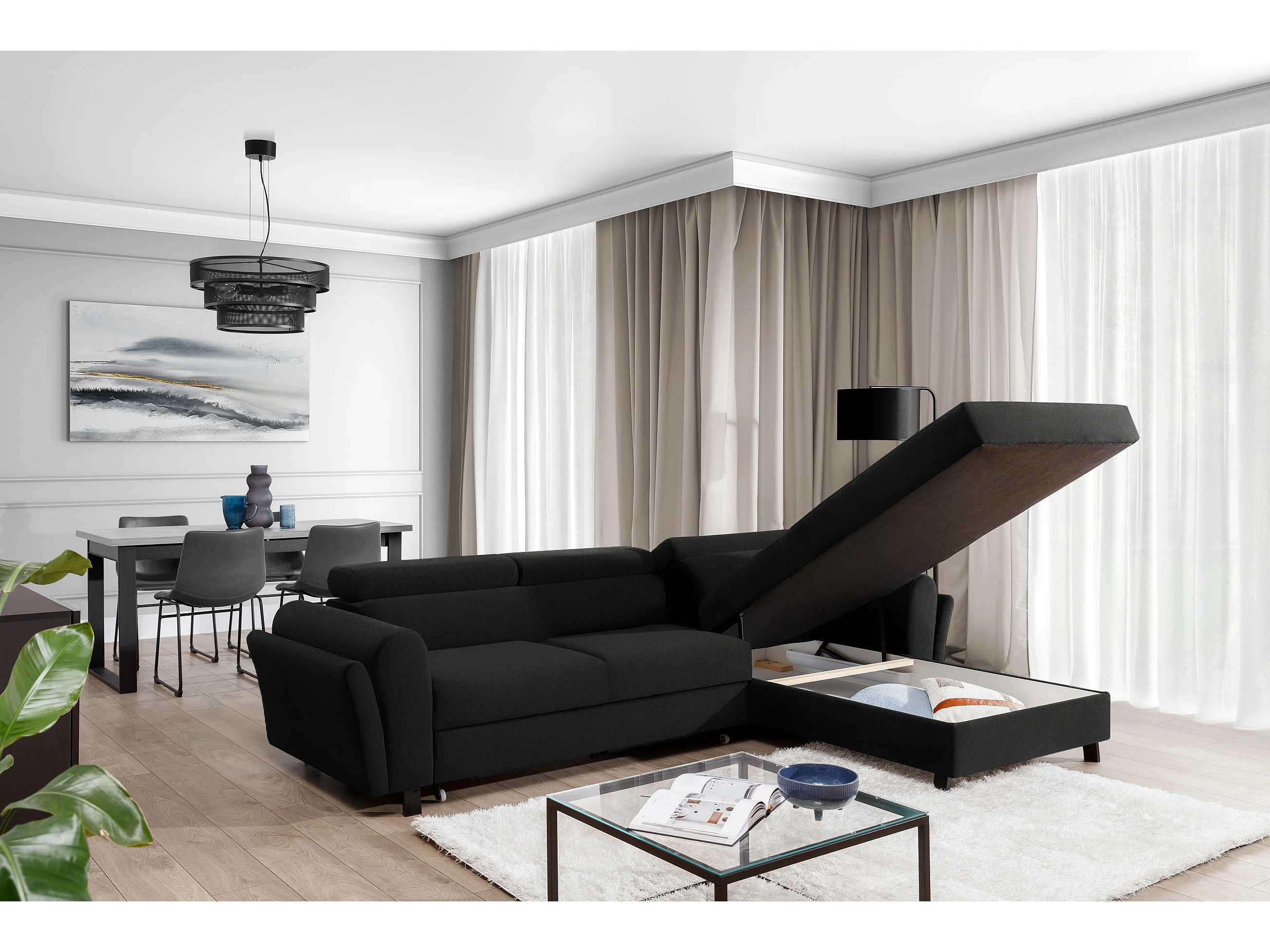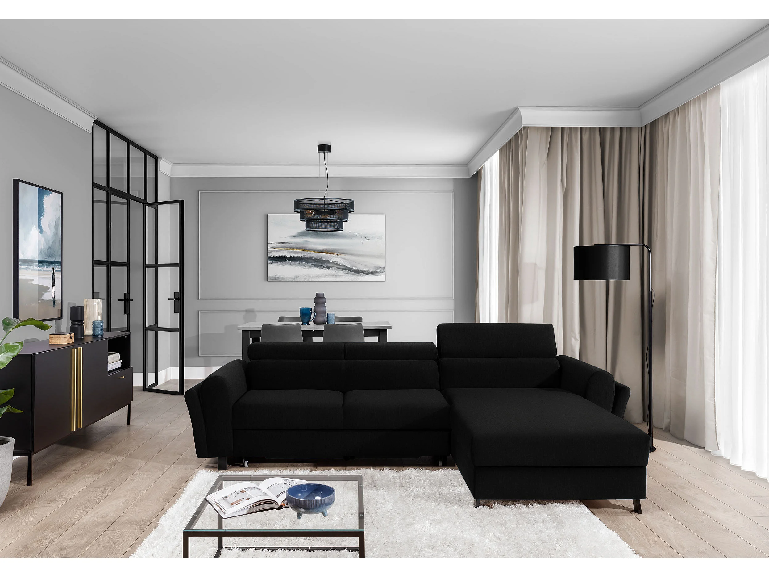 Converteerbare hoekbank rechts in zwarte stof met verstelbare hoofdsteunen Mazerali 300 cm