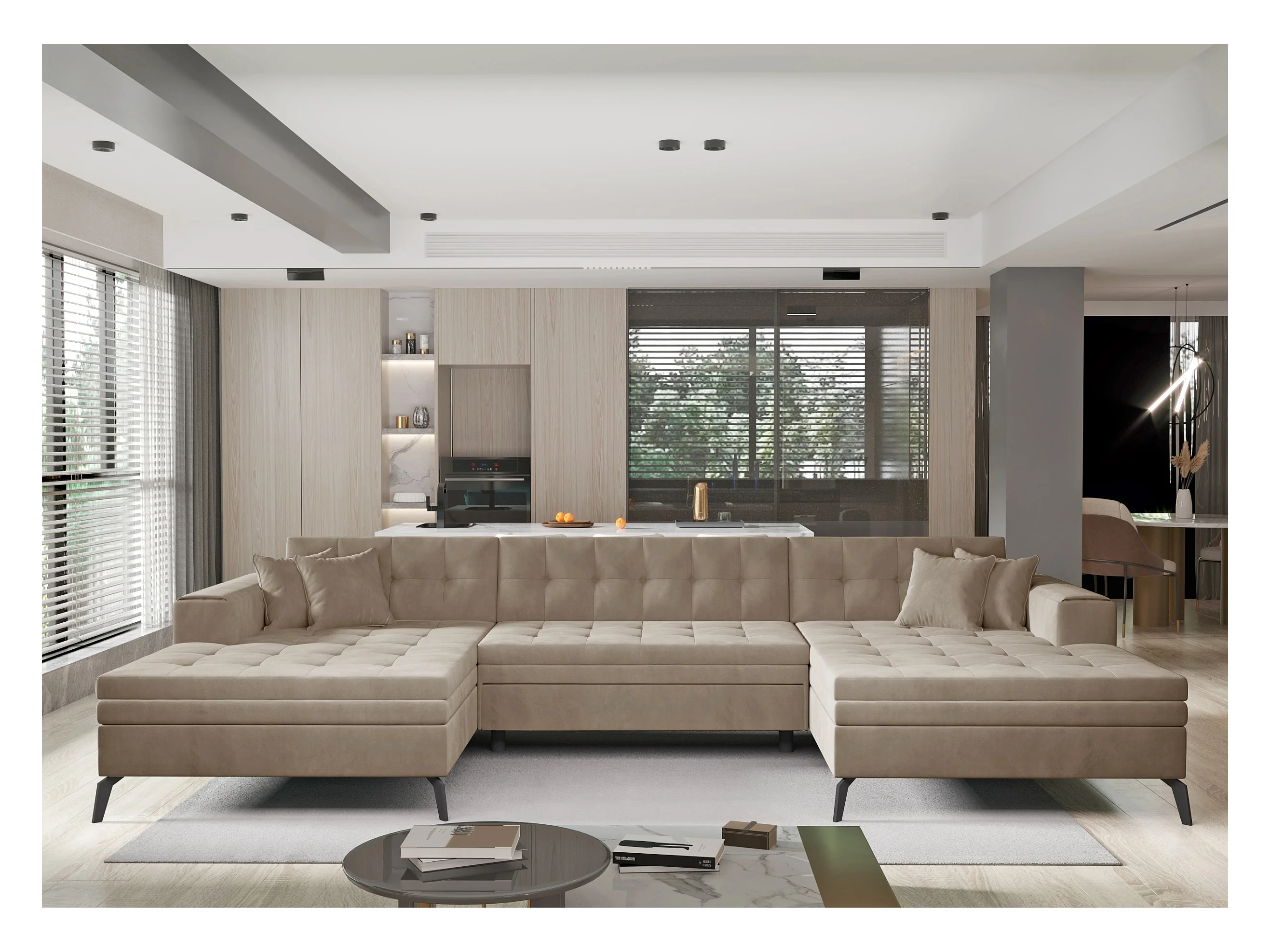 Panoramische slaapbank gewatteerd donkerbeige gemêleerde stof Romy 350 cm