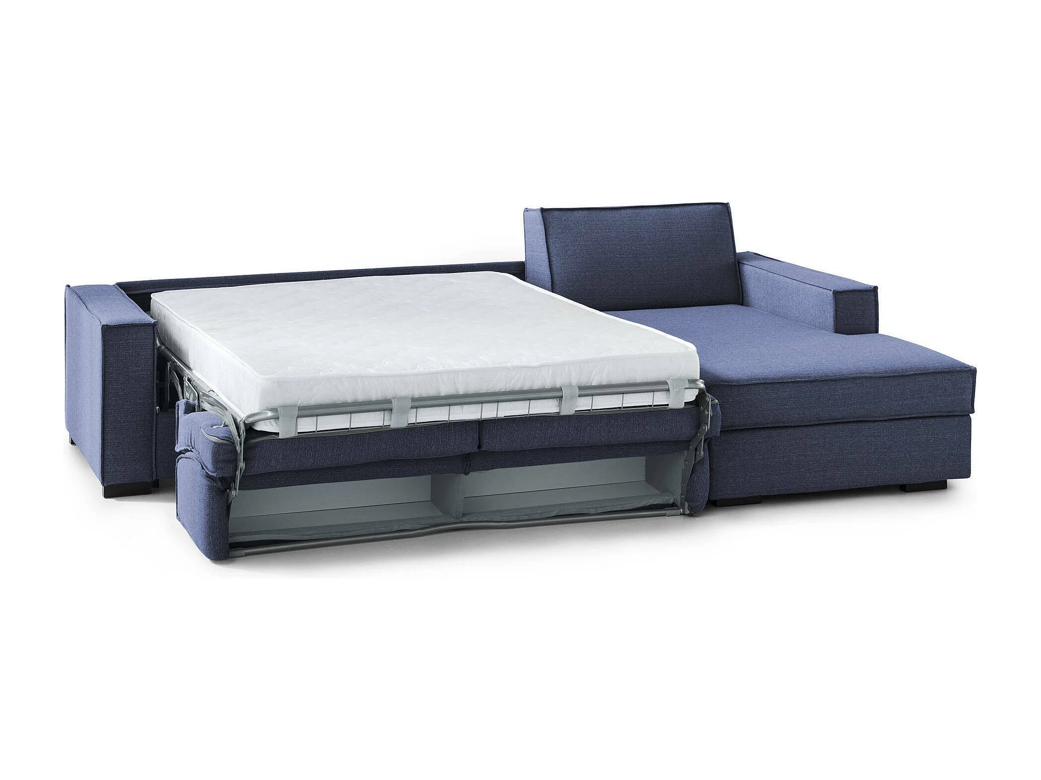 Daahje Slaapbank, Hoekbank, 100% Made in Italy, Bank met draaibare opening, Opbergschiereiland rechts, met standaard armleuningen, 280x95h90 cm, Blauw