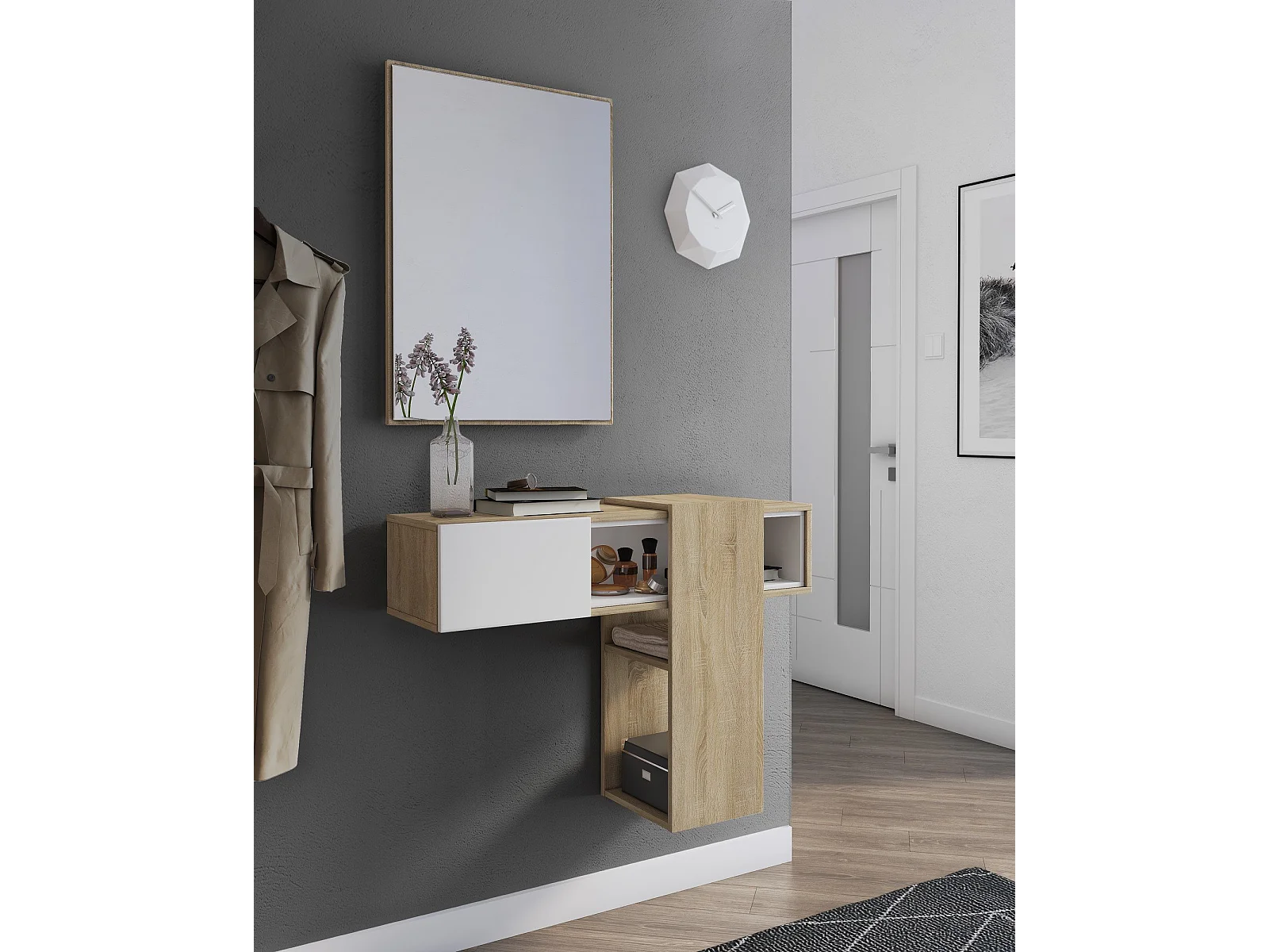 Daba-ingangsmeubel, Ingangshanger, Atrium-opstelling, M-functioneleerhouder, 100x31h75 cm, Eiken en Wit