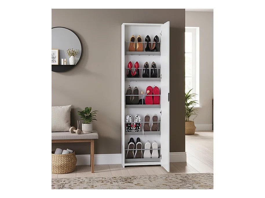 Eugene schoenenrek, Hoge schoenenkast met 1 deur, Moderne schoenenkast, Entreekast met spiegel, 50x22h180 cm, Wit