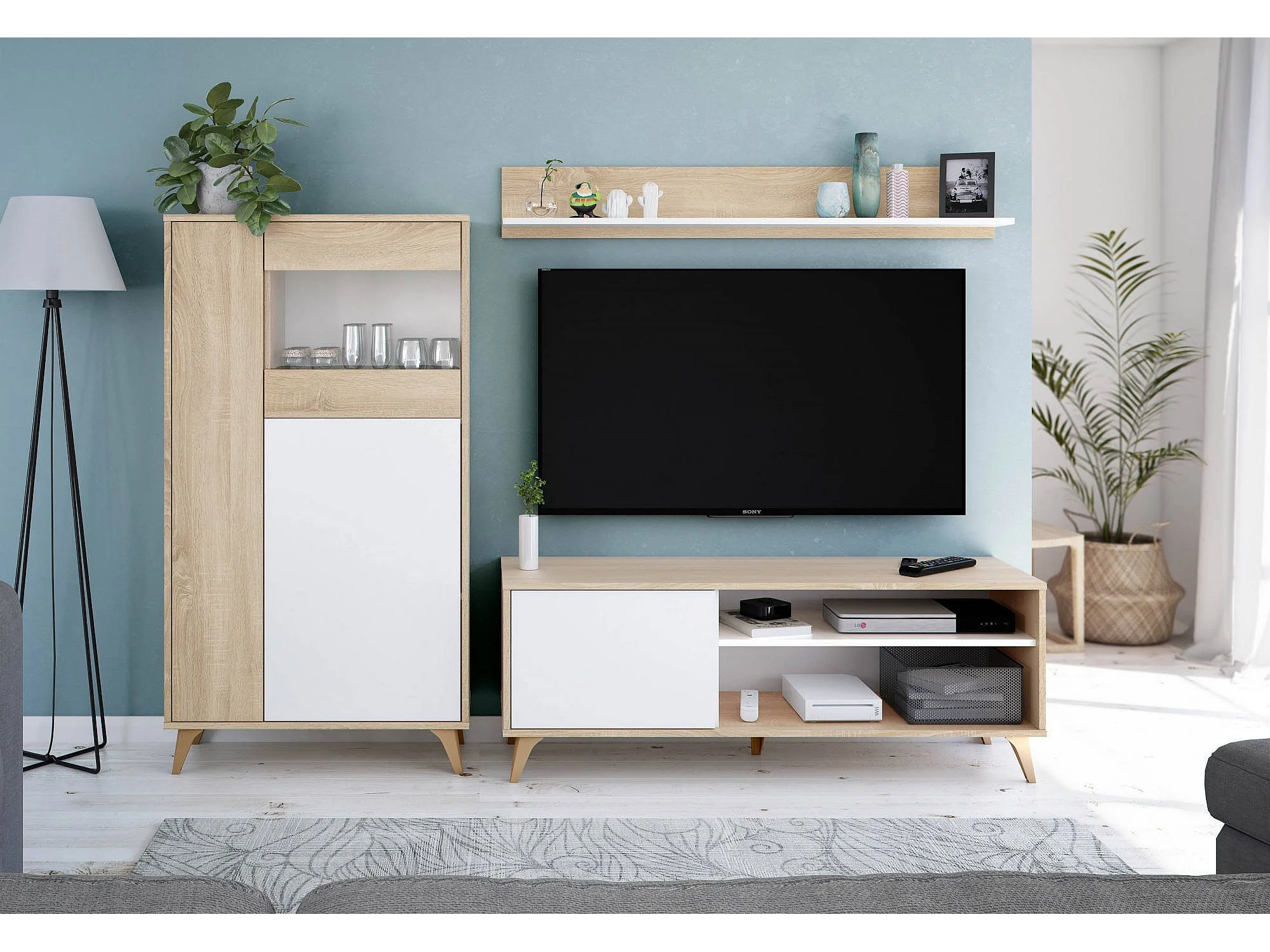 Daceved vitrinekast, Moderne vitrinekast met 3 deuren, Dressoir voor woonkamer of lounge, Hoog dressoir met planken, 77x33h142 cm, Eiken en Wit